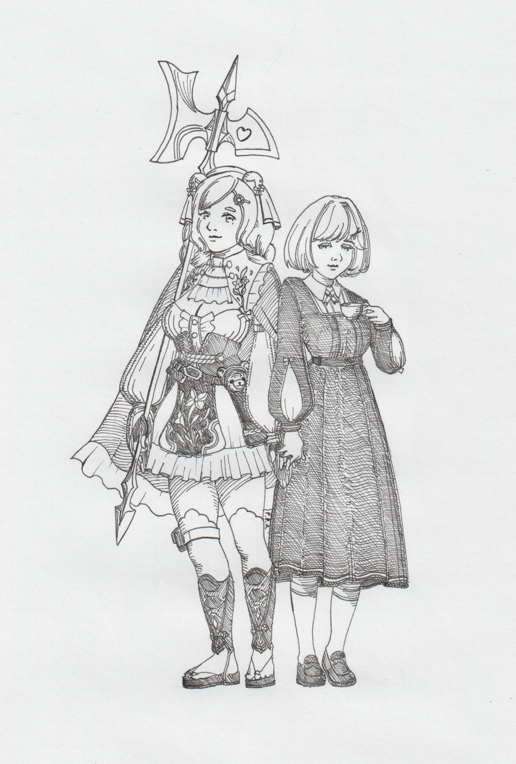 A drawing of Freyaguma and Miss Nightingale, retro ♡ mantique friends! Parts of it were a little rushed because I finished it just before leaving for DoKoMi.