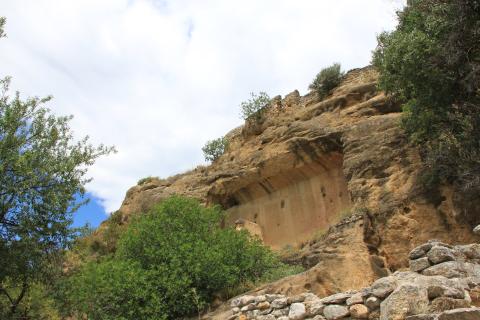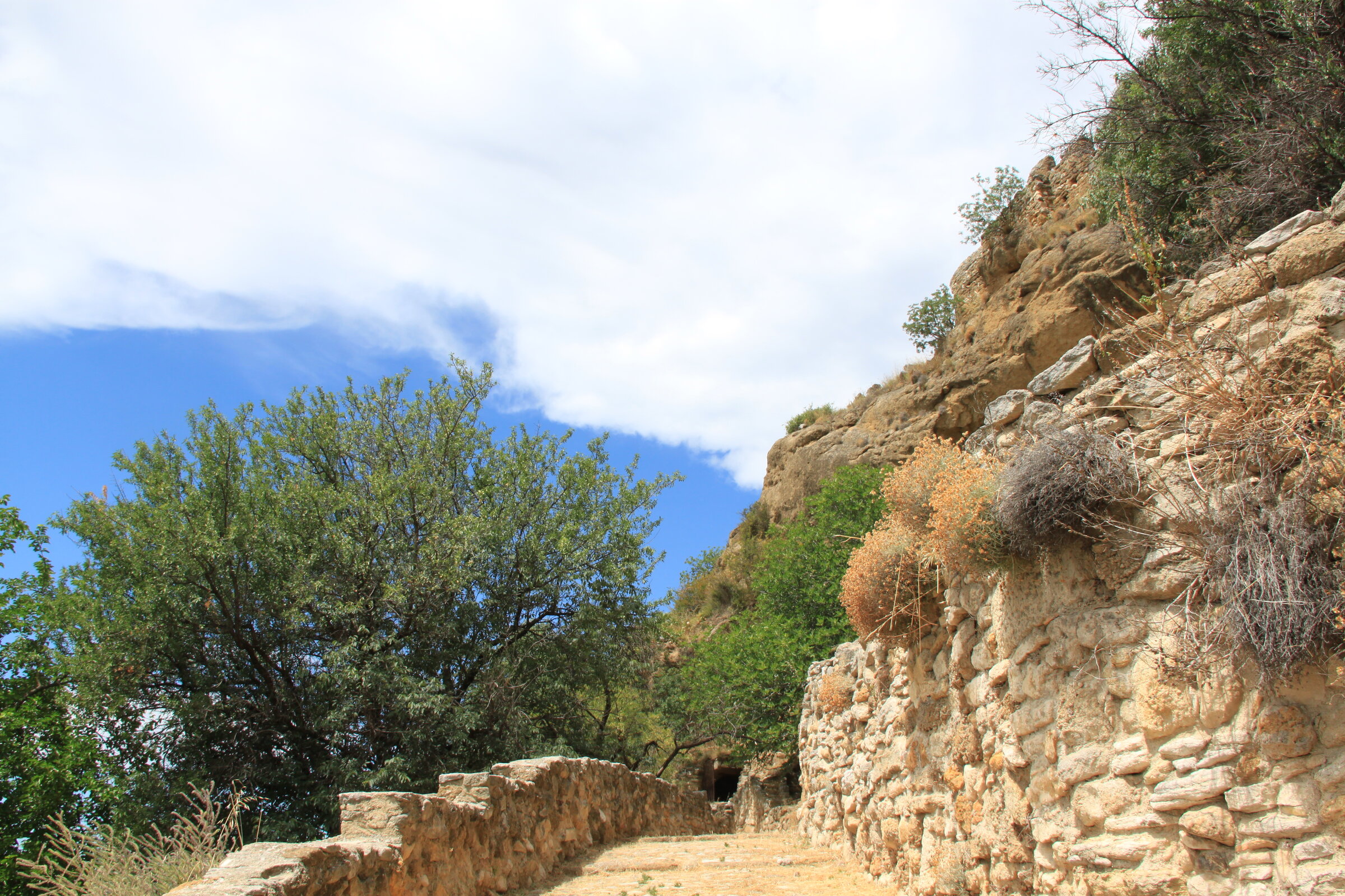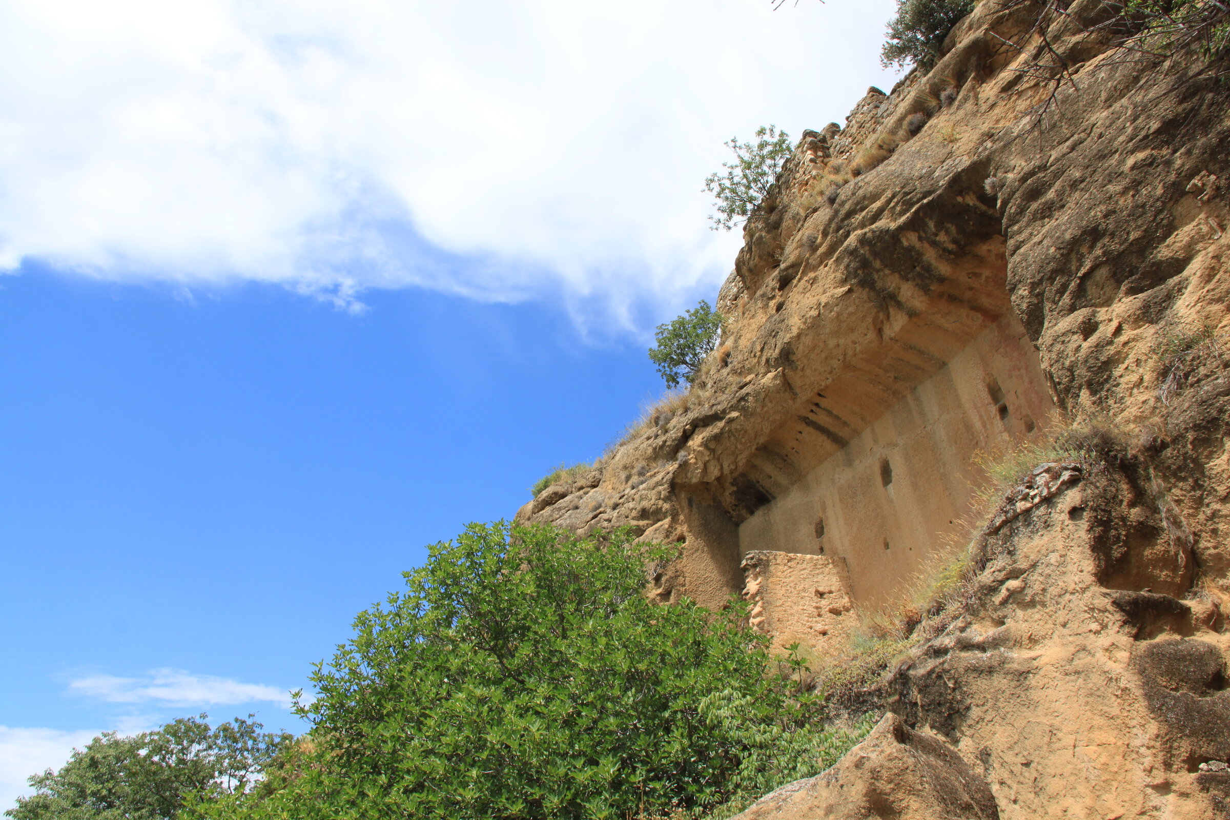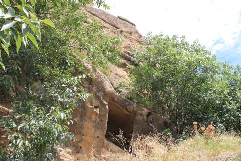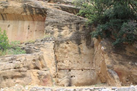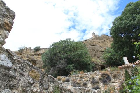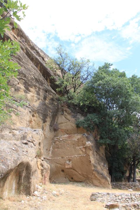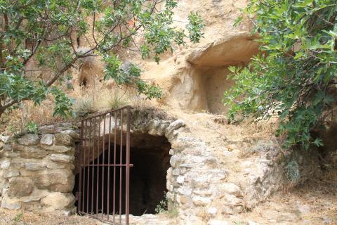 Uphill, at the edge of the old town, there is a faux-antique amphitheatre (a popular meeting spot for the many stray cats) surrounding some of the genuinely antique eponymous caves. In prehistoric times used as a shelter, millstones were quarried from the rock in later ages.