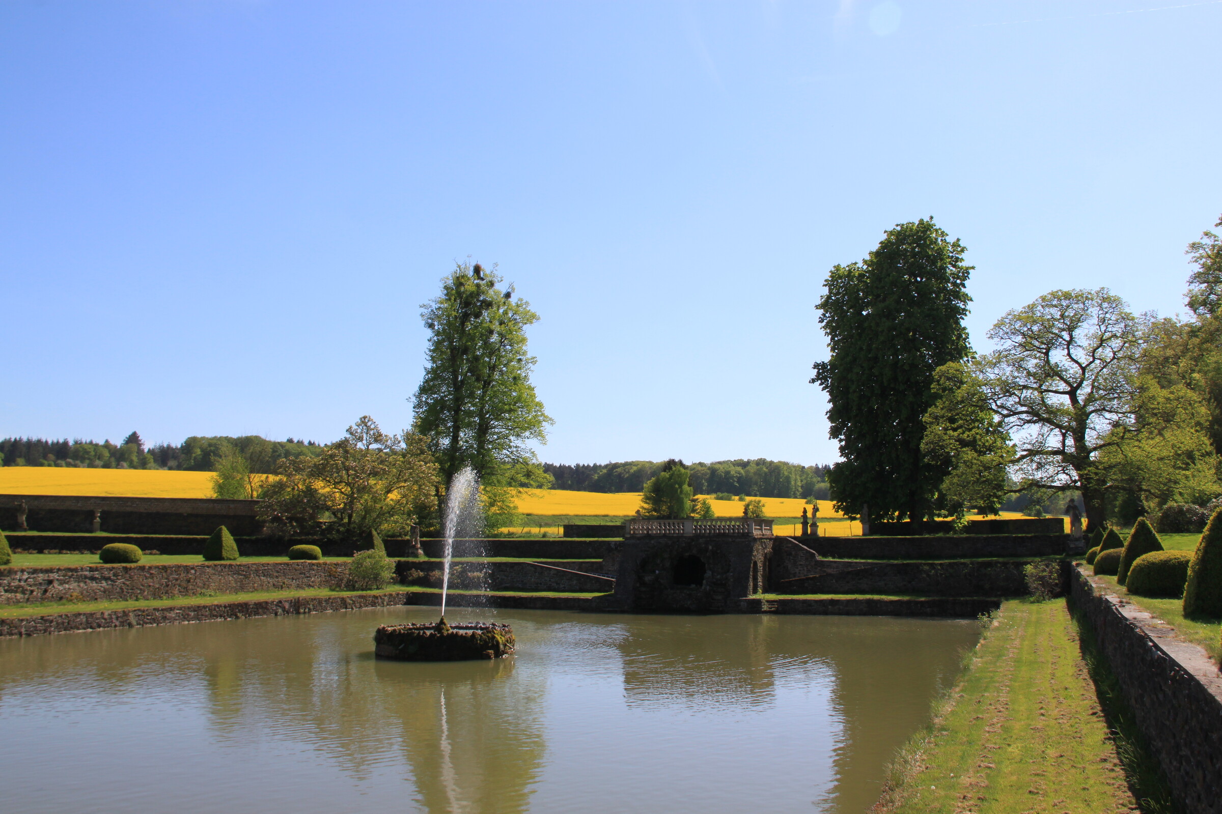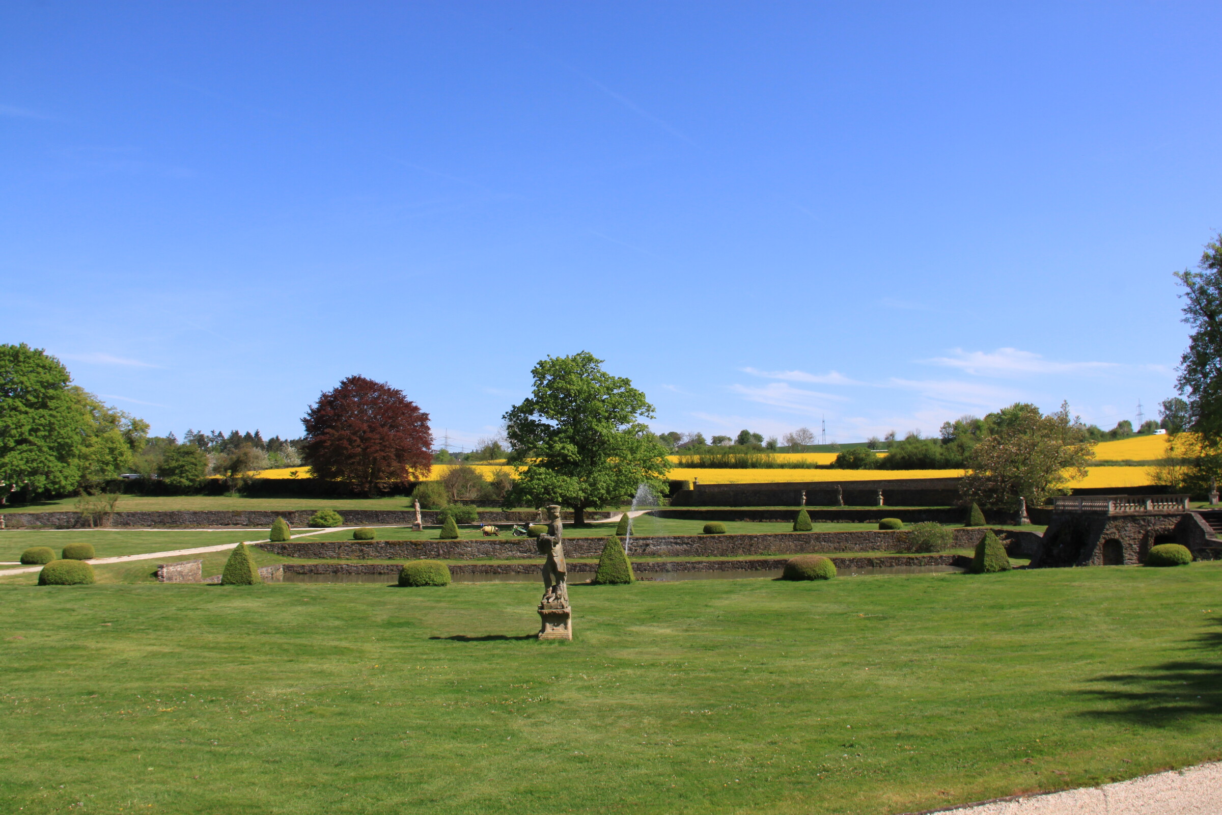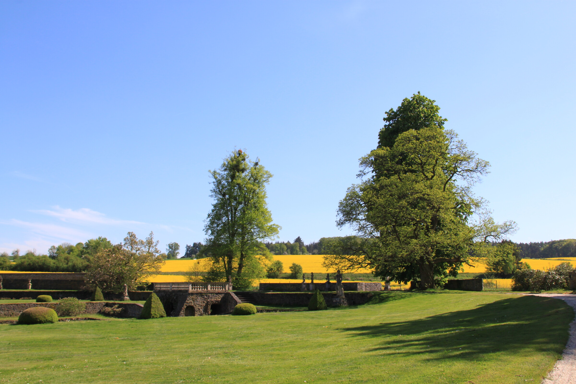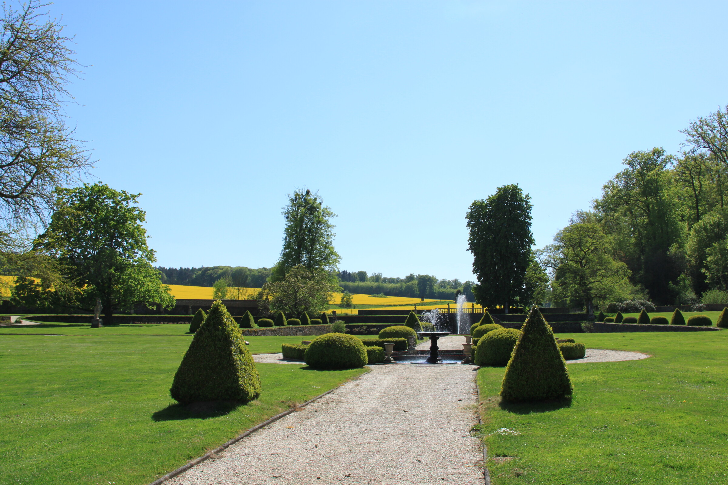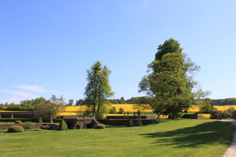 The garden is very elegant. An axis runs from the courtyard over the bridge and through a fountain, a pool, a grotto, and finally a trio of statues into the distance The borders of the garden blend into the landscape, and the bright yellow of the rape fields beyond form a nice background.