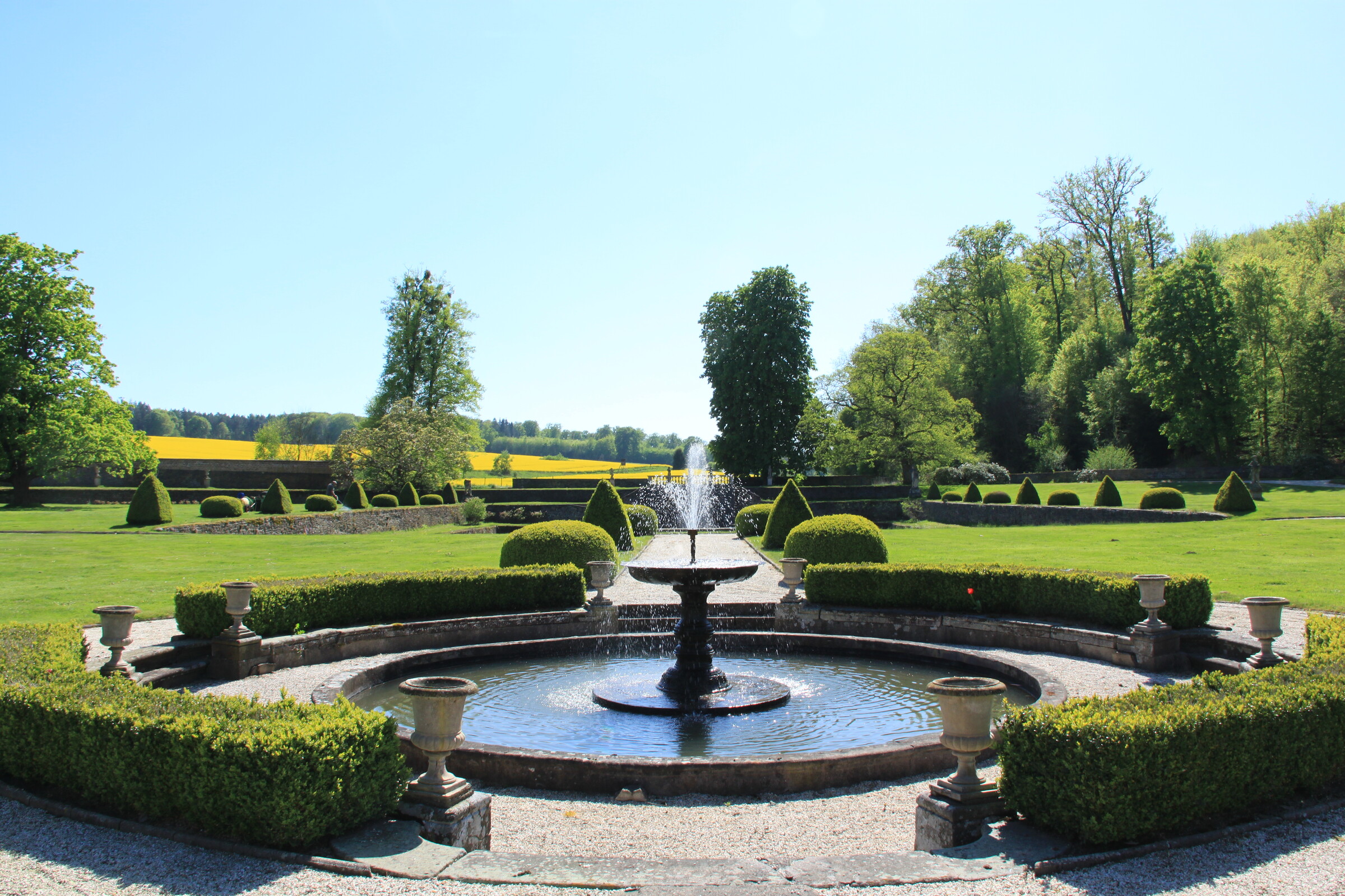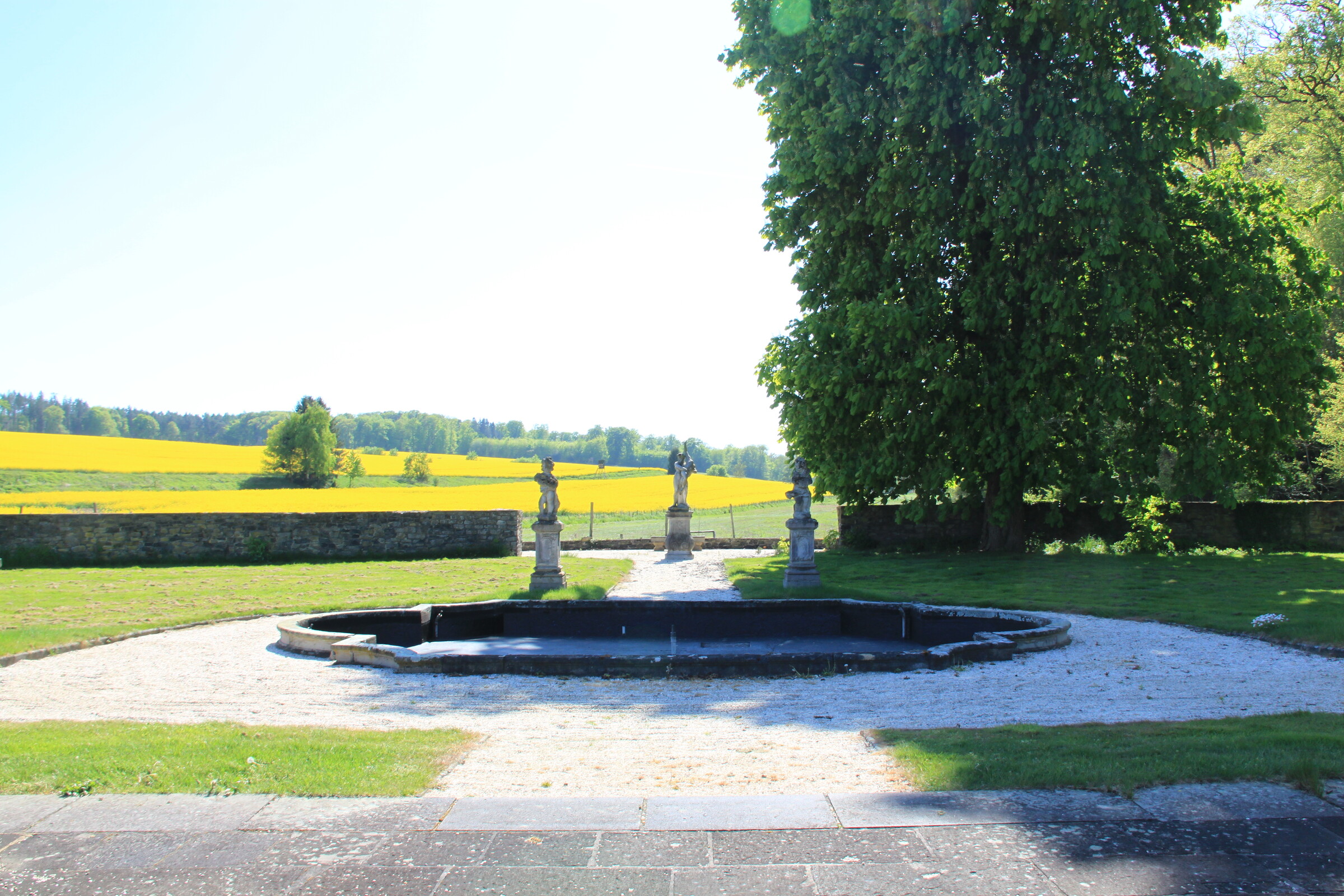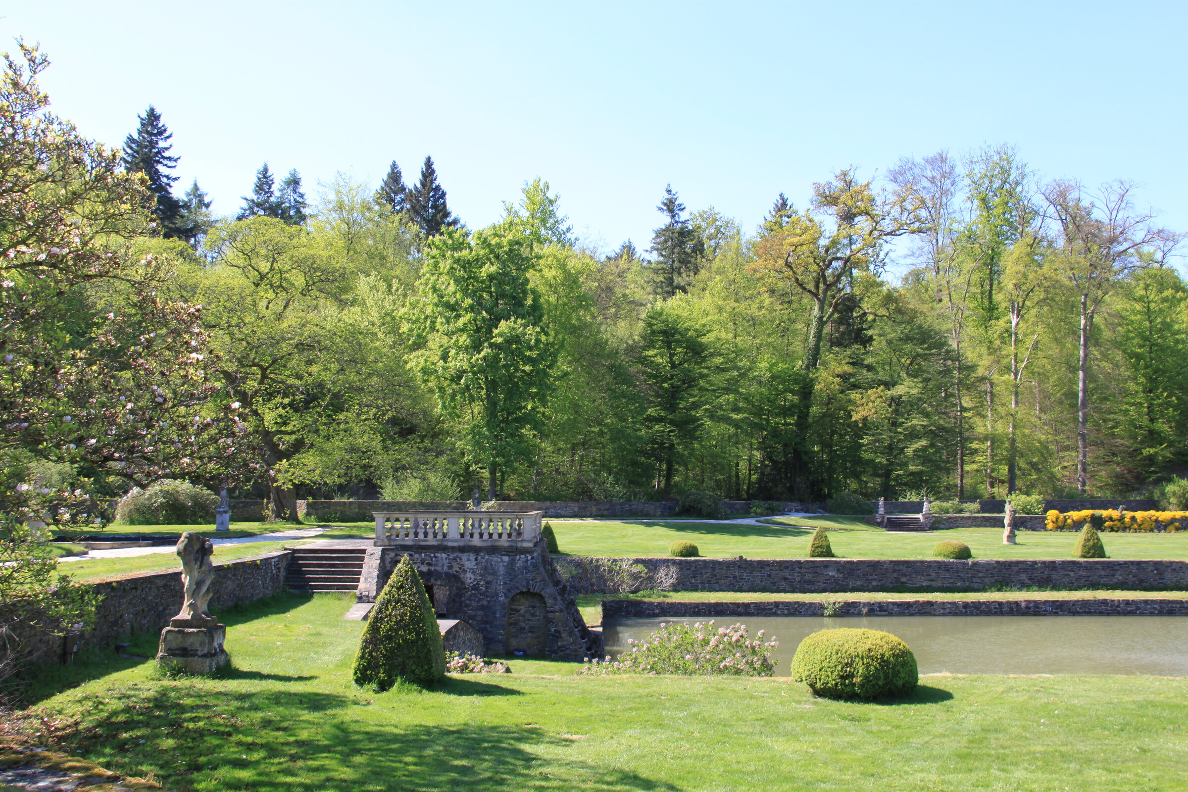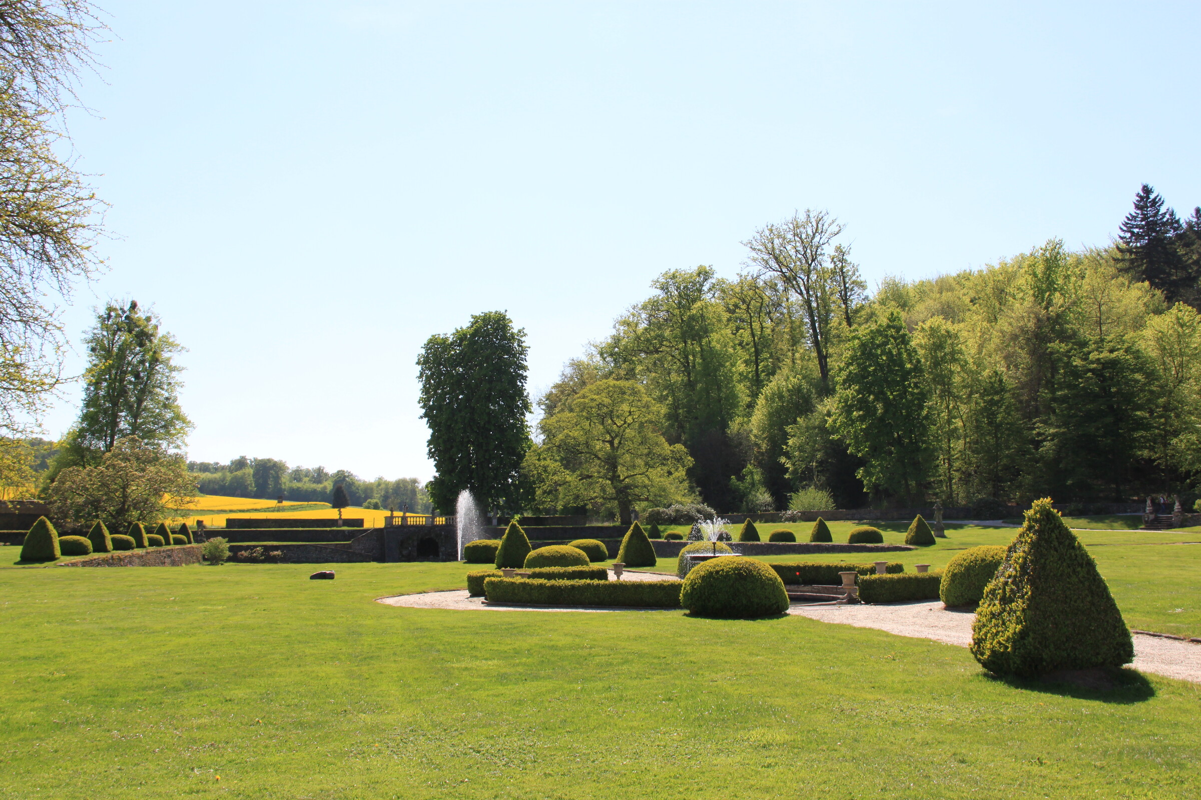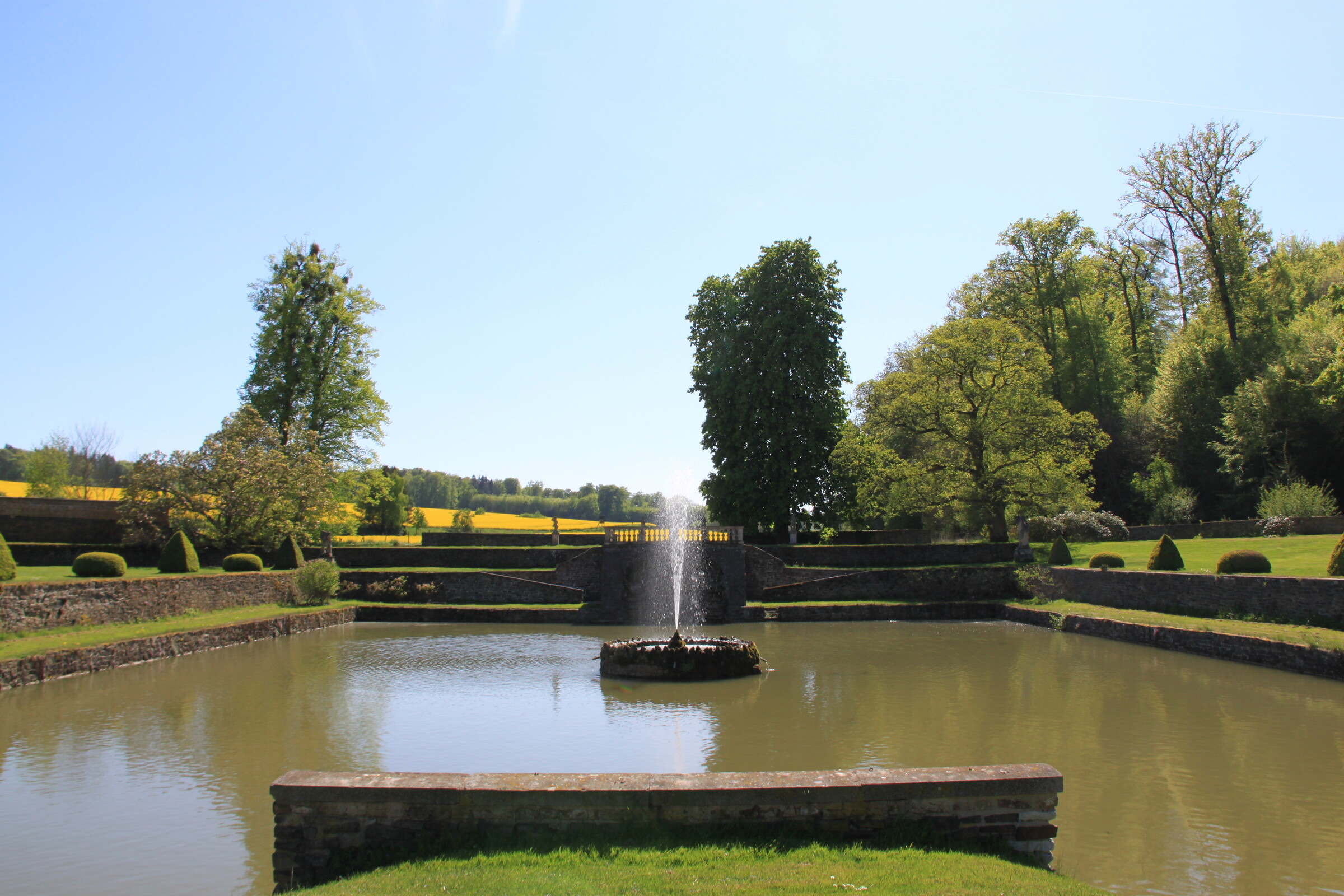 The garden is very elegant. An axis runs from the courtyard over the bridge and through a fountain, a pool, a grotto, and finally a trio of statues into the distance The borders of the garden blend into the landscape, and the bright yellow of the rape fields beyond form a nice background.