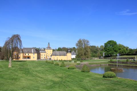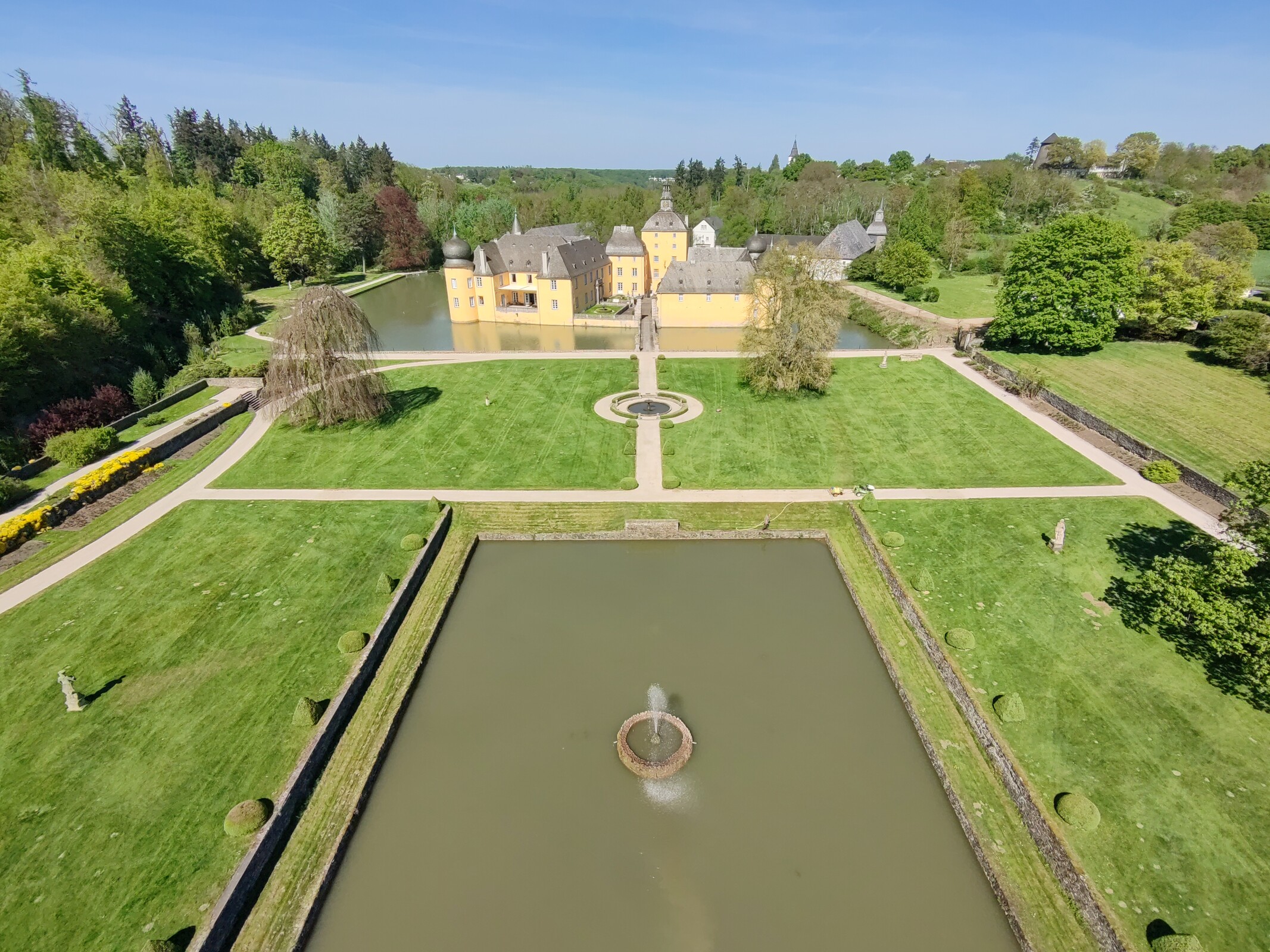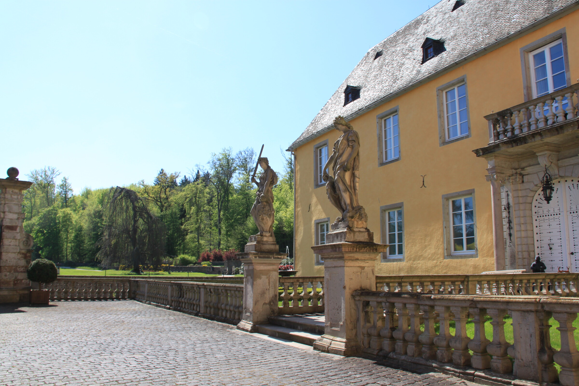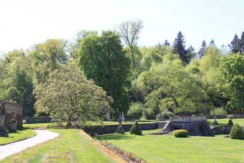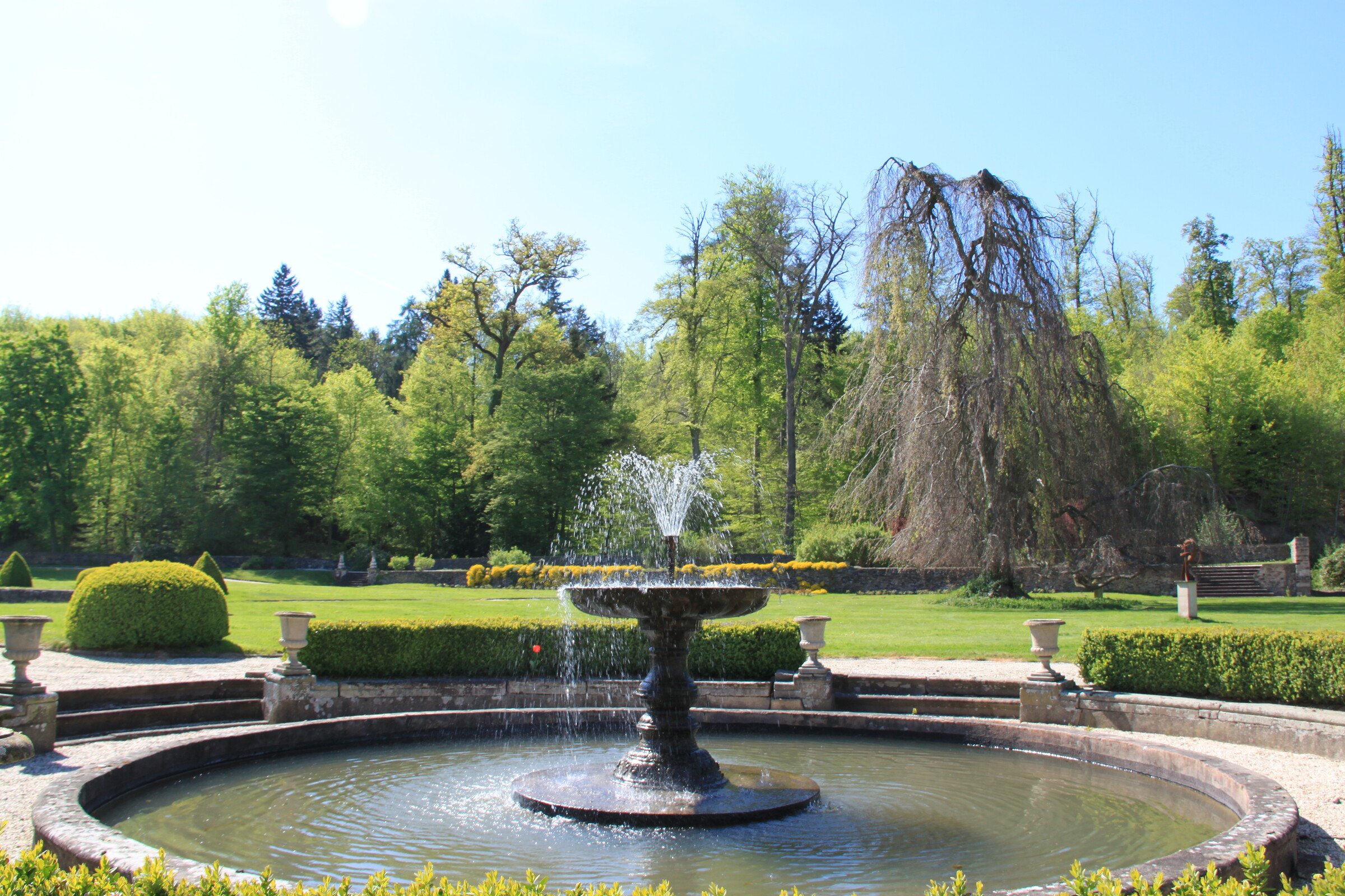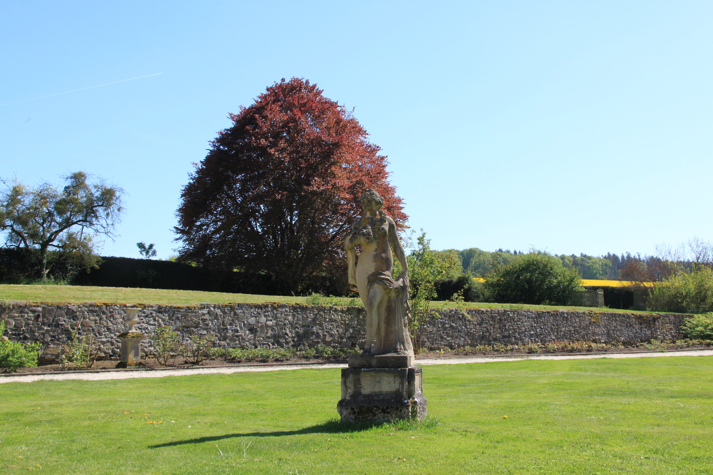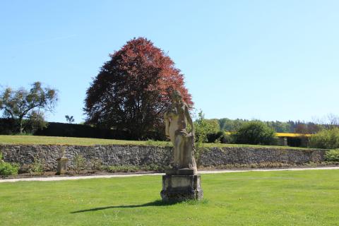 The garden is very elegant. An axis runs from the courtyard over the bridge and through a fountain, a pool, a grotto, and finally a trio of statues into the distance The borders of the garden blend into the landscape, and the bright yellow of the rape fields beyond form a nice background.