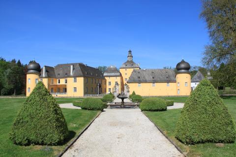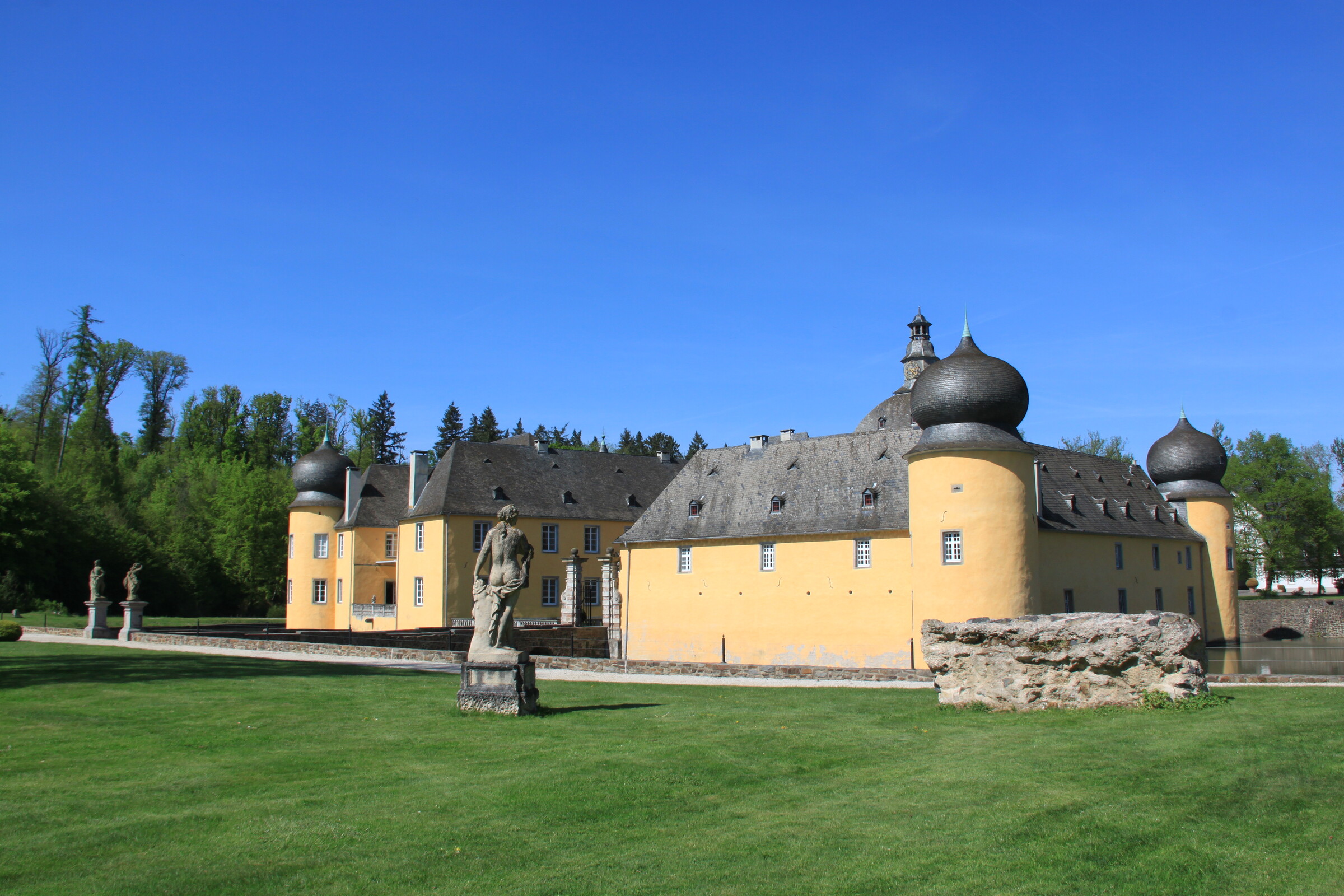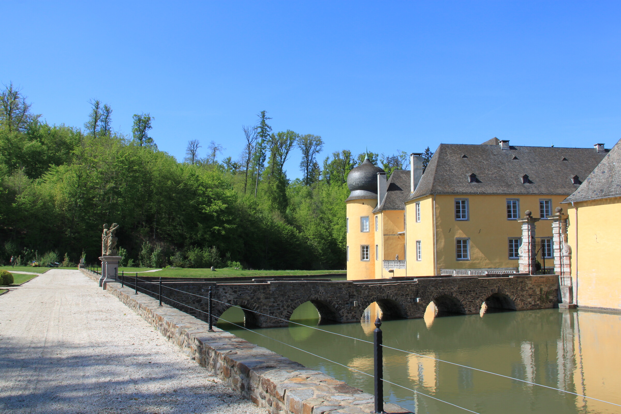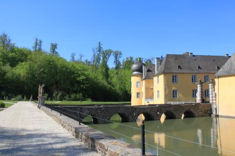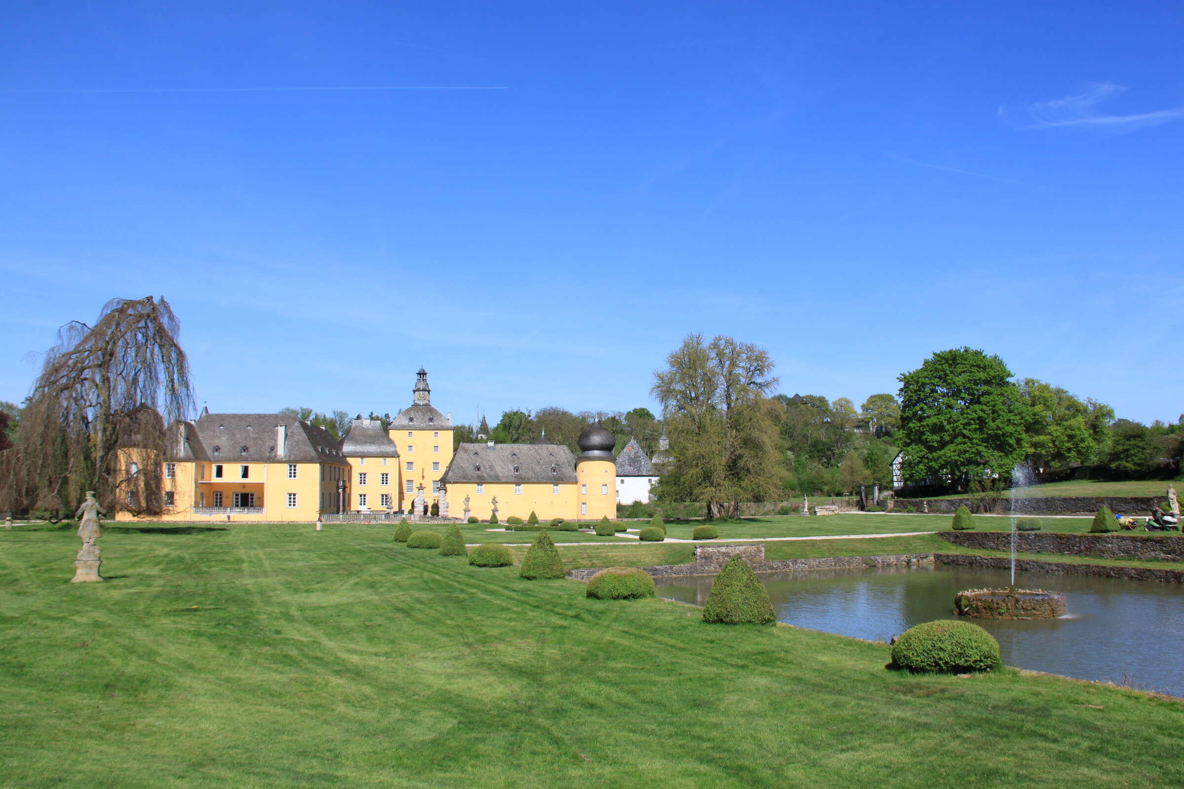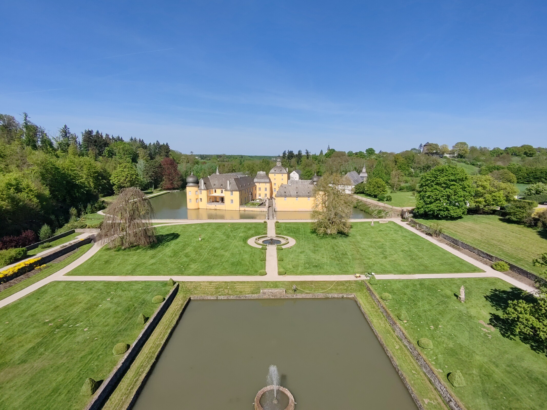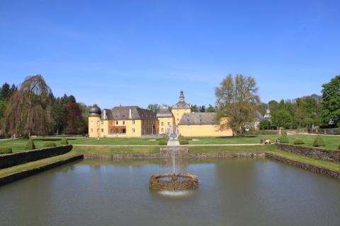 The garden is very elegant. An axis runs from the courtyard over the bridge and through a fountain, a pool, a grotto, and finally a trio of statues into the distance The borders of the garden blend into the landscape, and the bright yellow of the rape fields beyond form a nice background.
