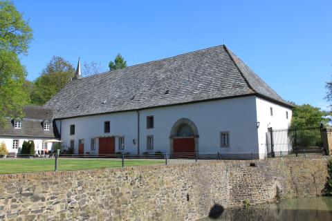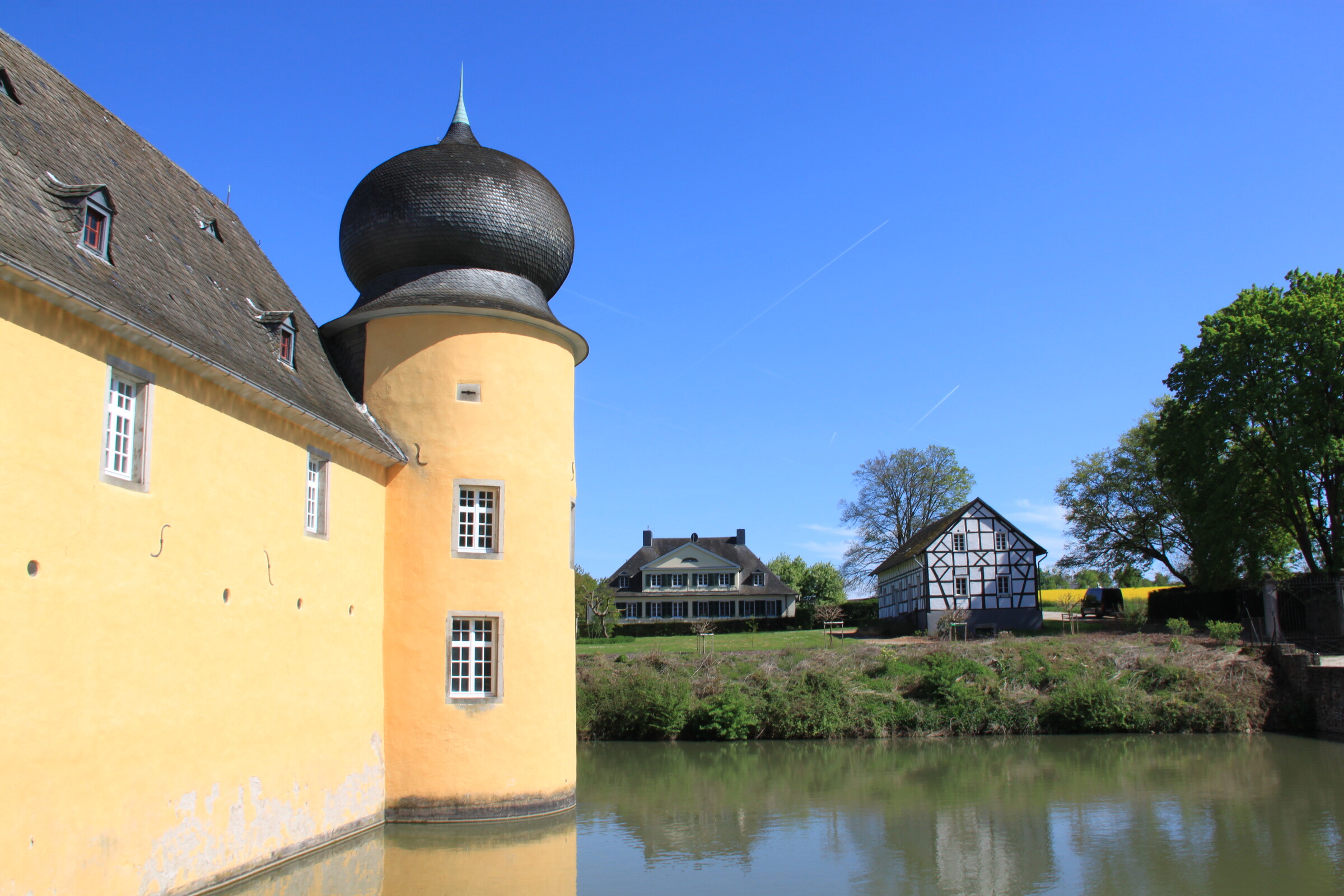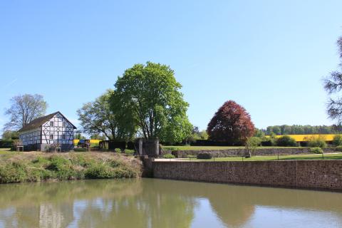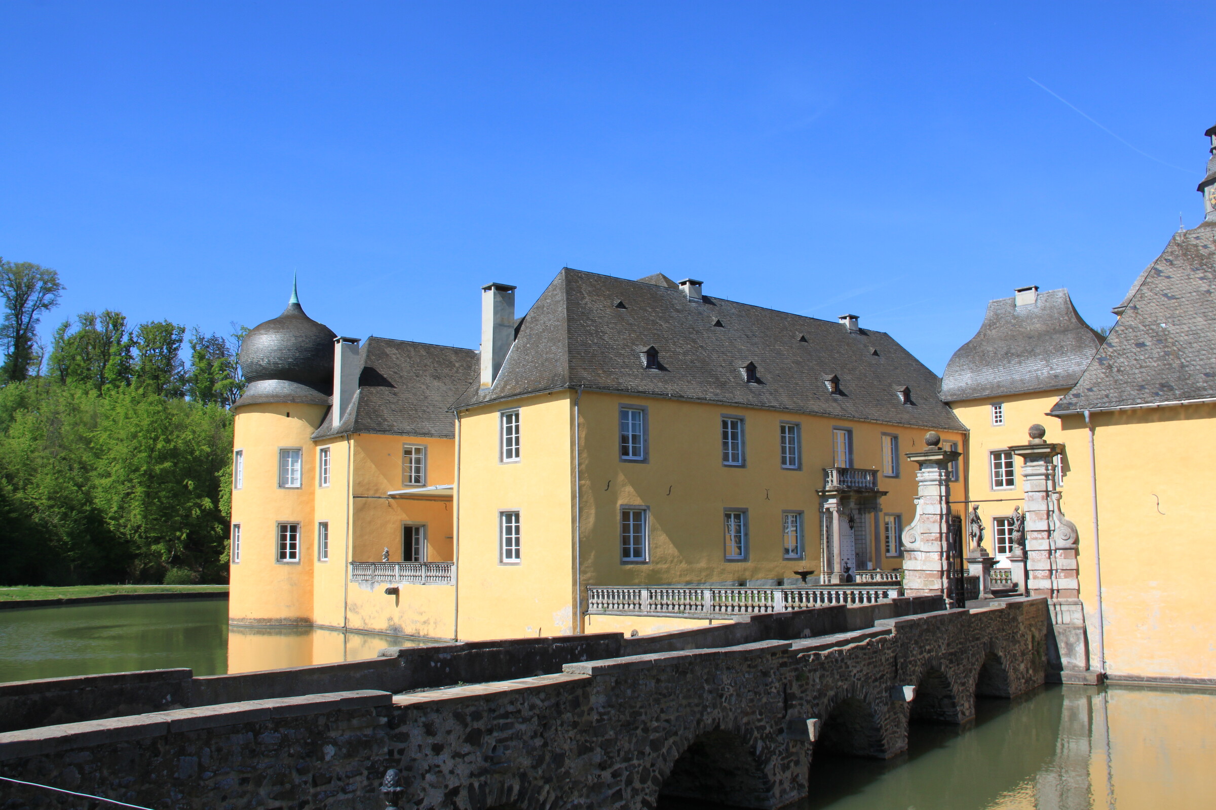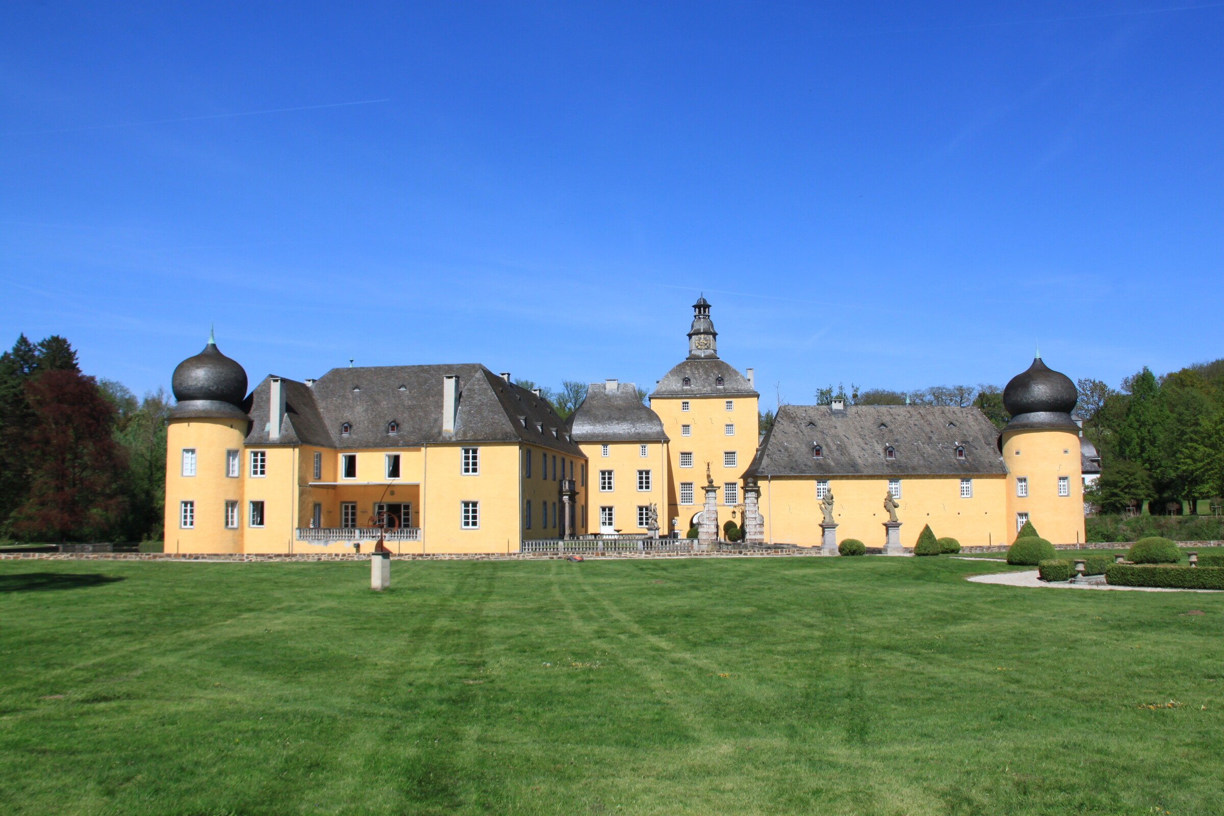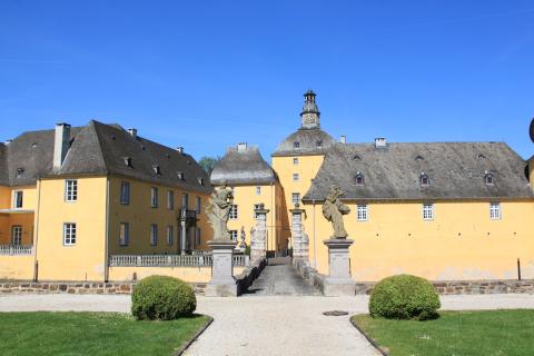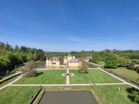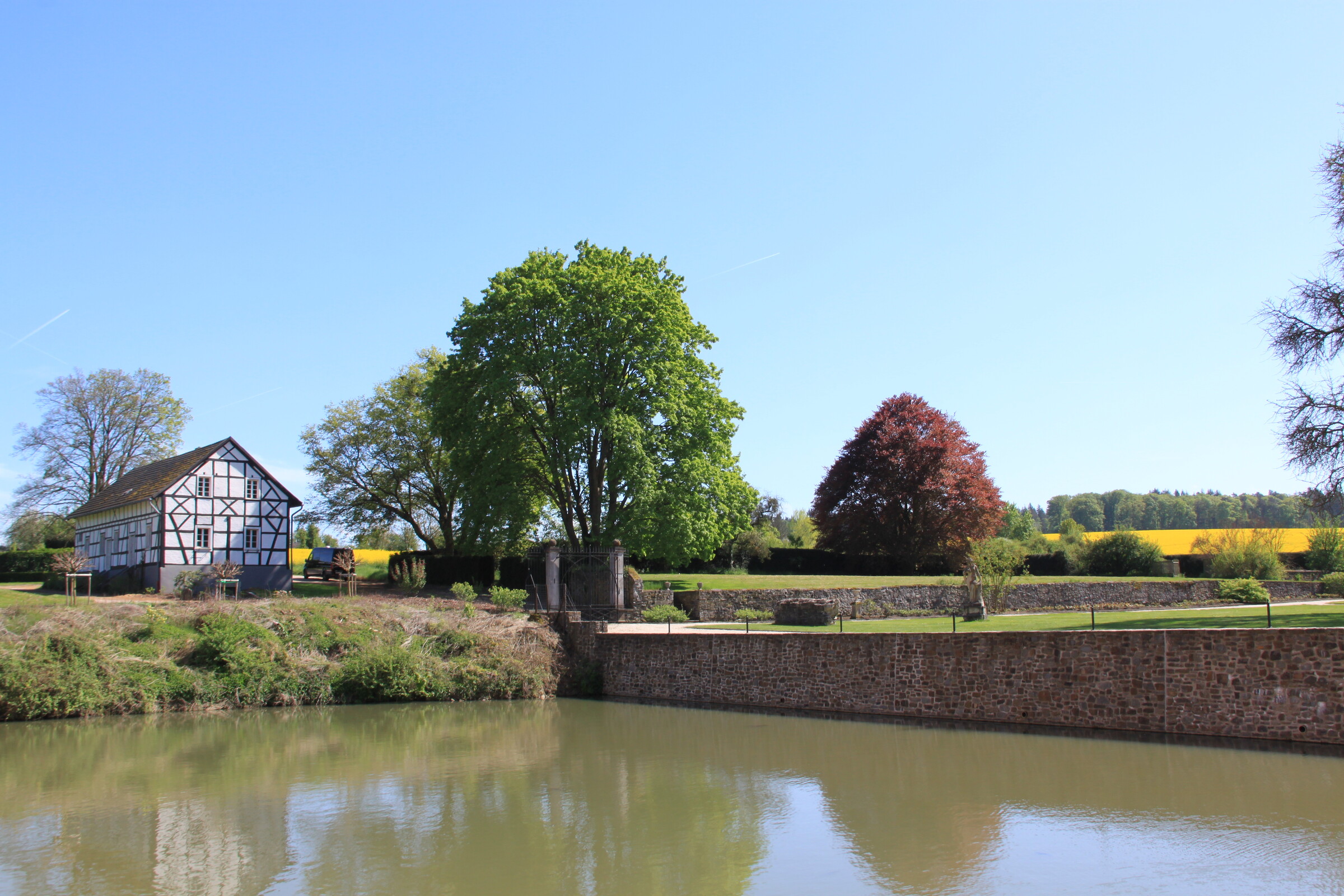 The garden is very elegant. An axis runs from the courtyard over the bridge and through a fountain, a pool, a grotto, and finally a trio of statues into the distance The borders of the garden blend into the landscape, and the bright yellow of the rape fields beyond form a nice background.