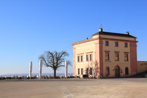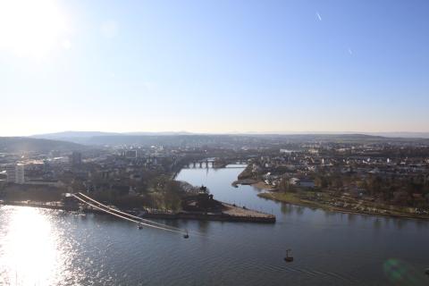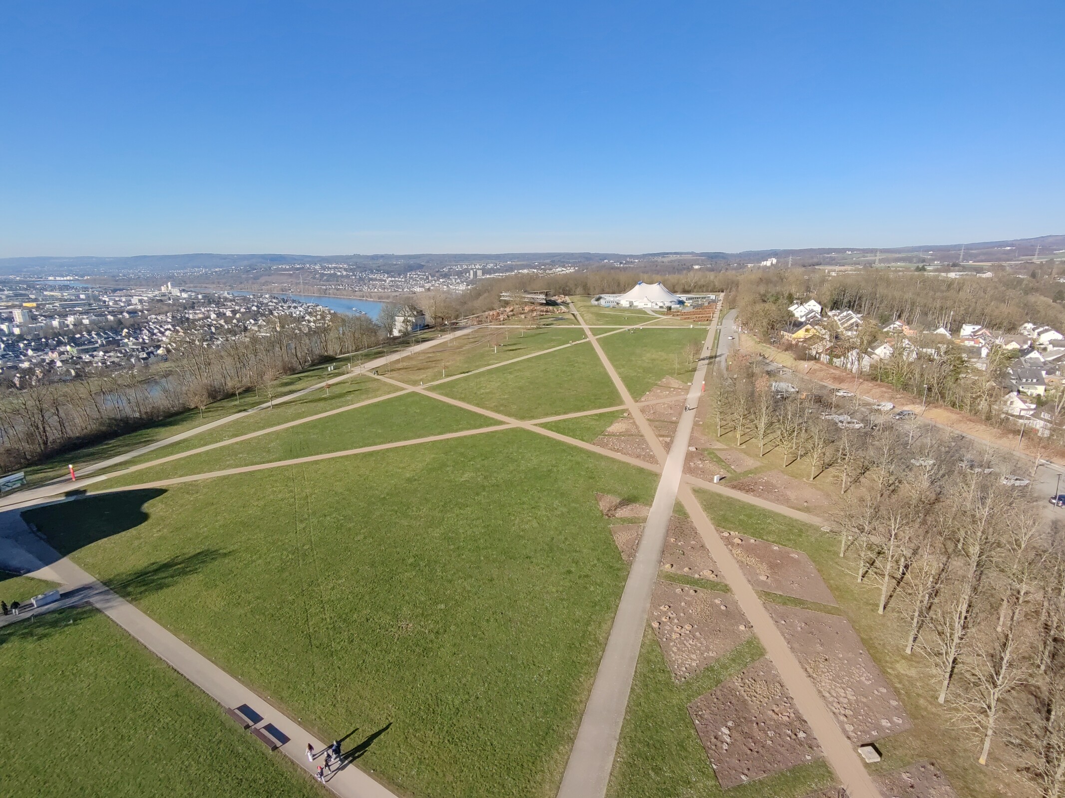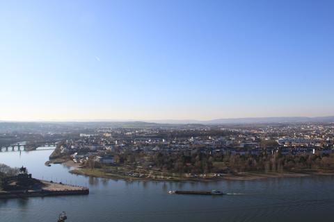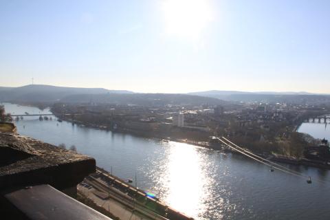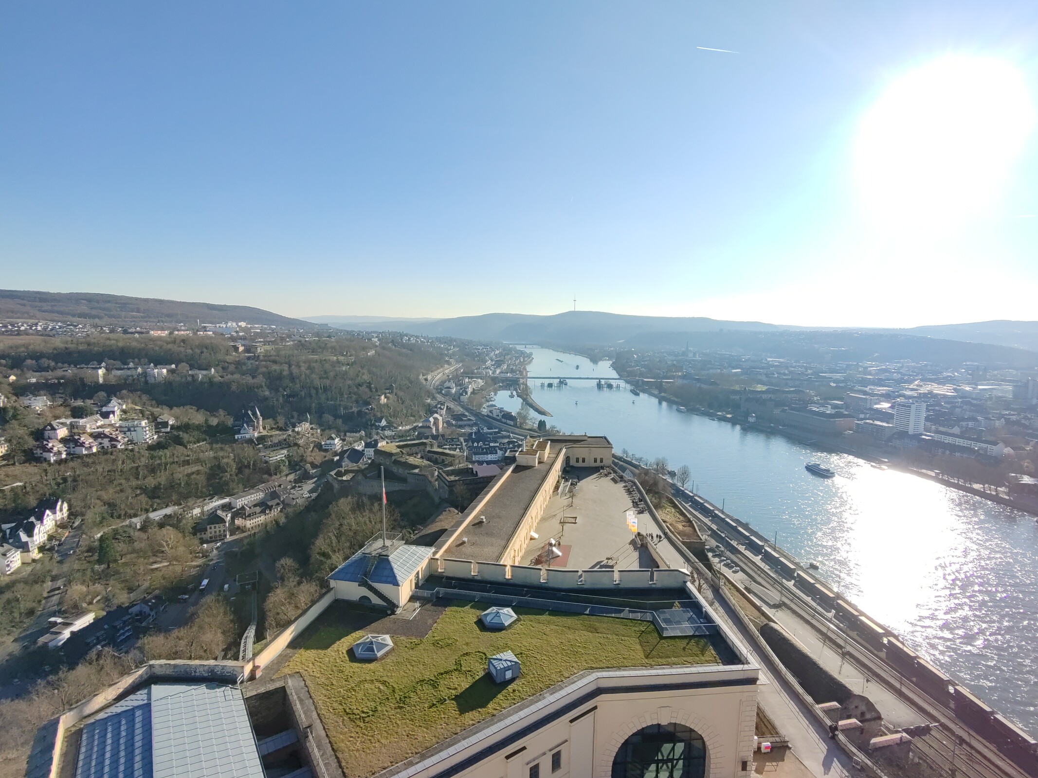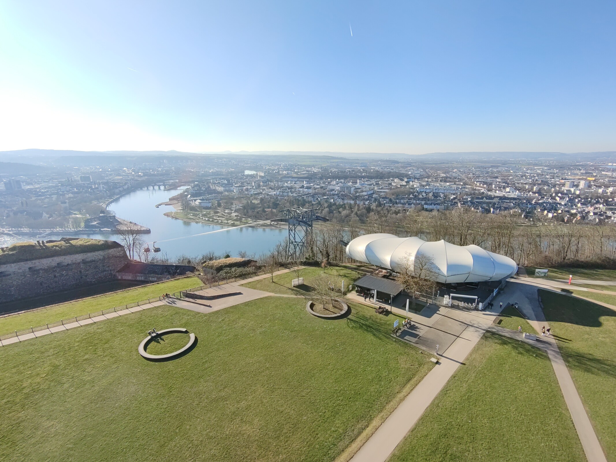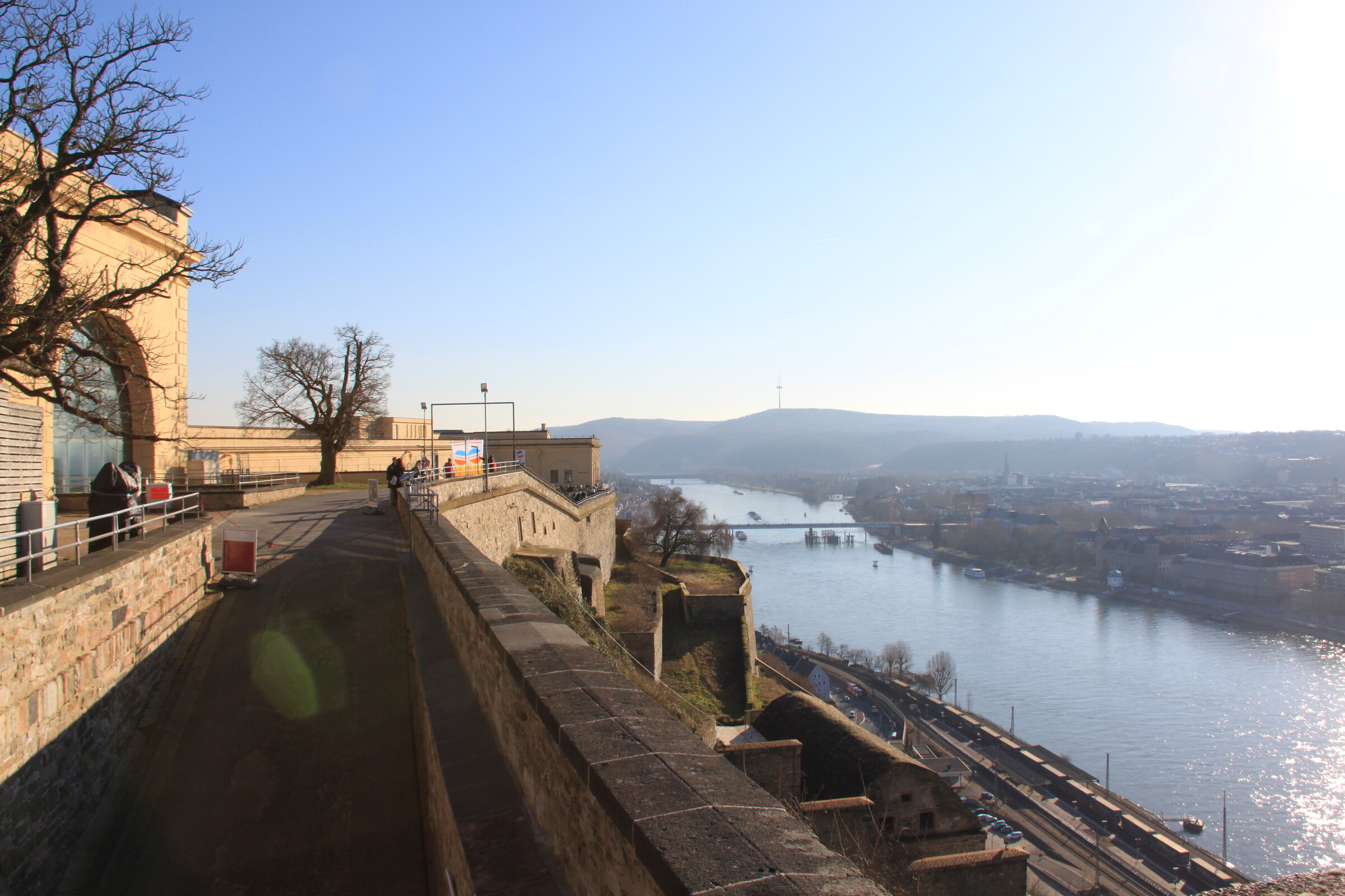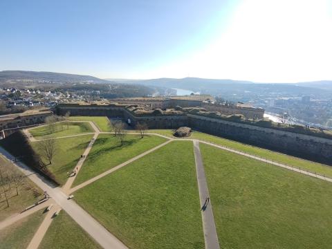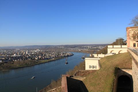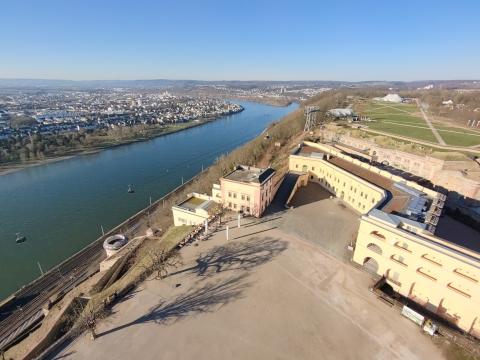 Inside, the vast courtyard opens up to a grand, panoramic view of Koblenz, the Rhine, the Moselle, and the entire region.
