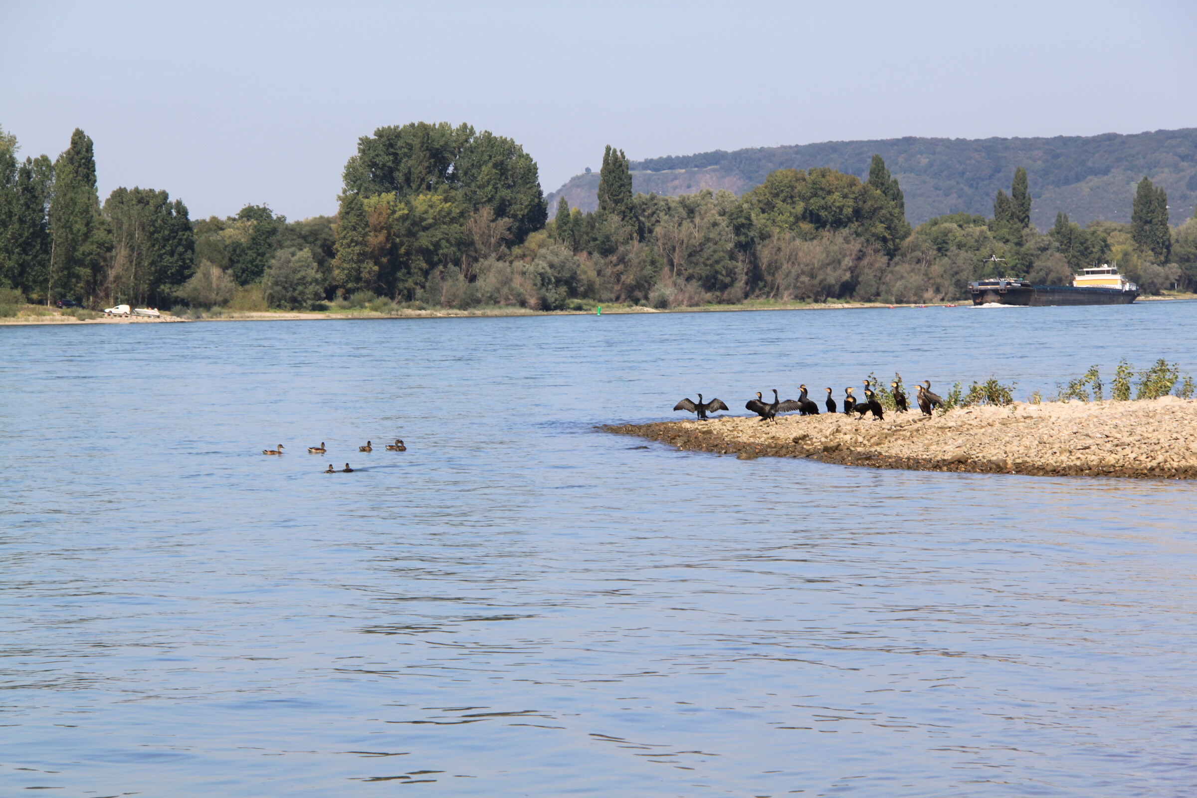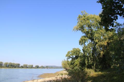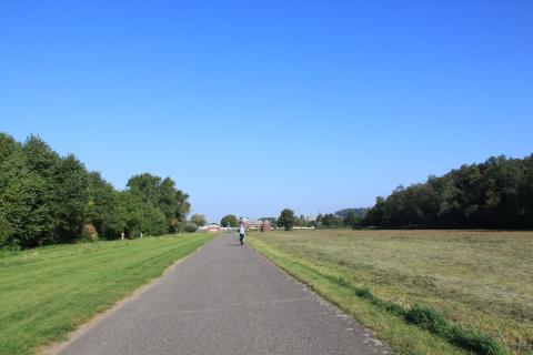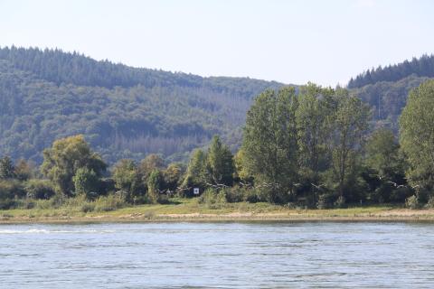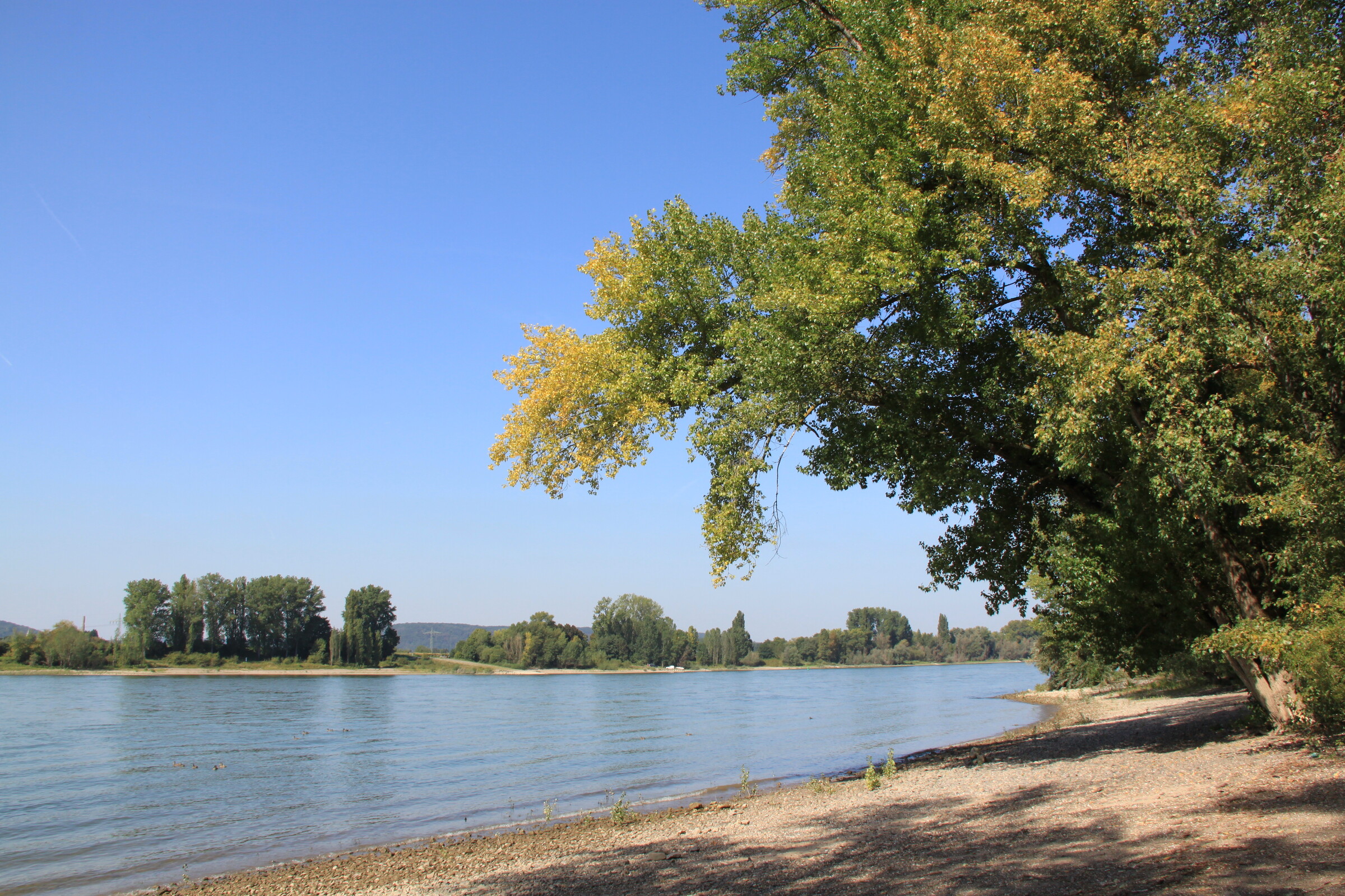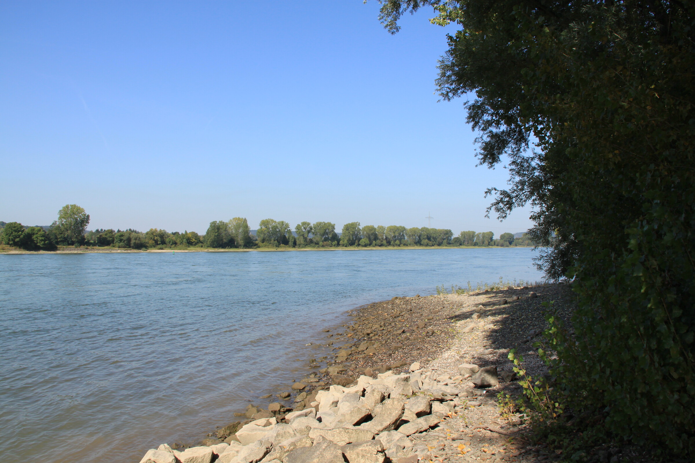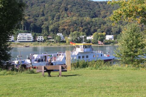 Between the ferry and the city is an expansive campsite. The city also sports a large factory. From the left side of the Rhine, the white steam from its gleaming, towering chimneys can seen from far away, but from here it's barely visible.