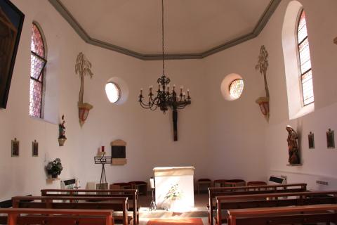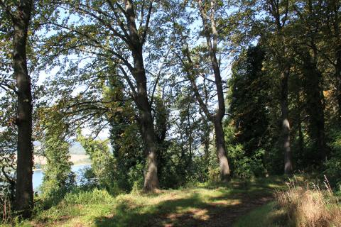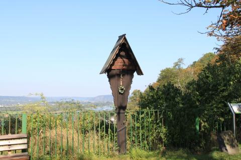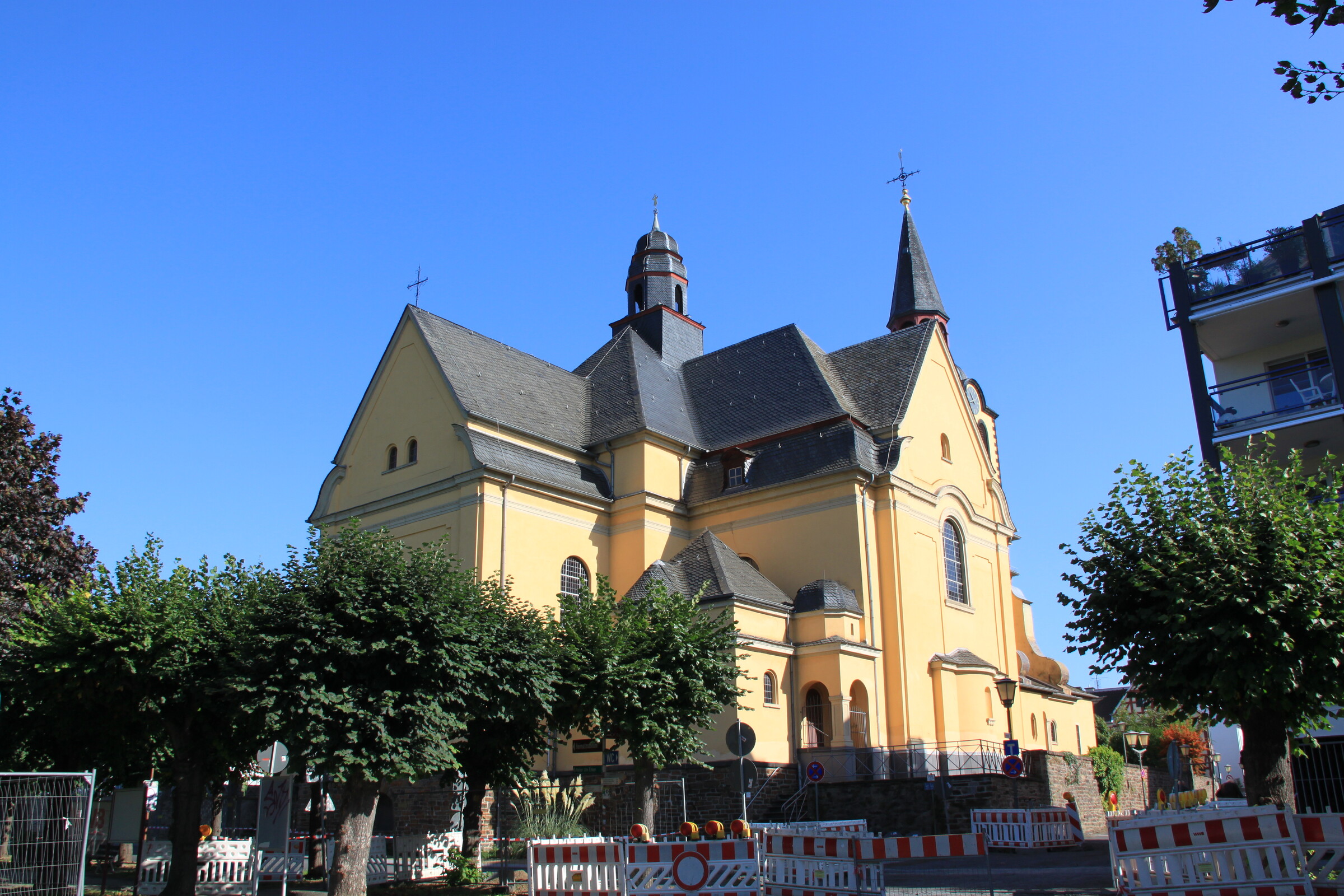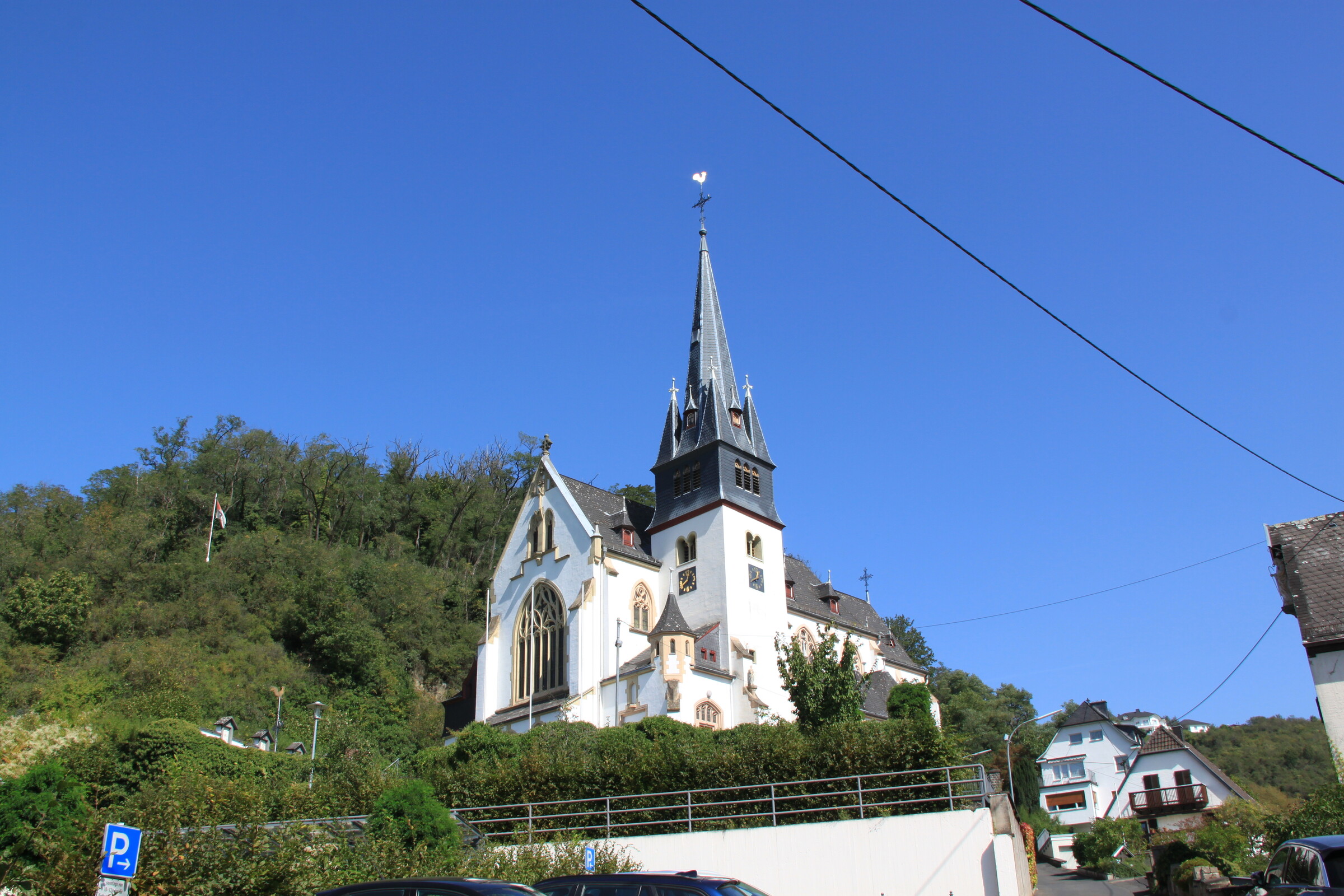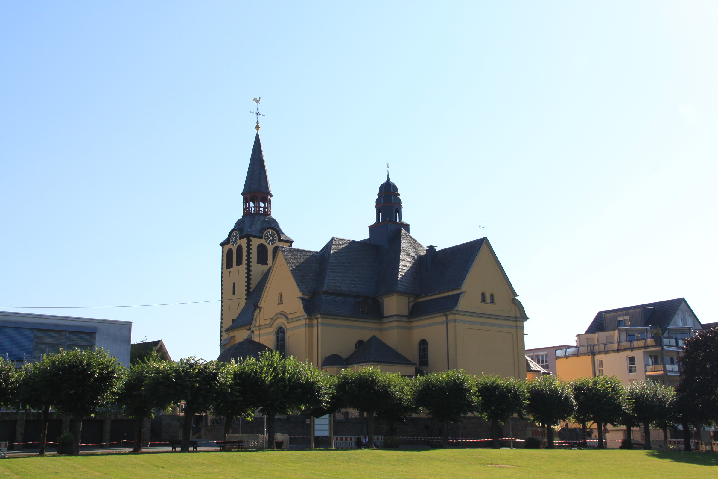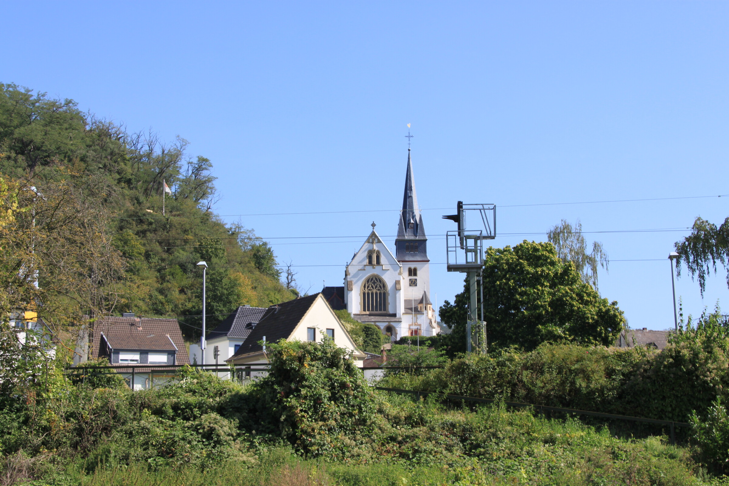The church was closed. Towards the Rhine, there's a wide open lawn; on the other side, Bad Breisig.