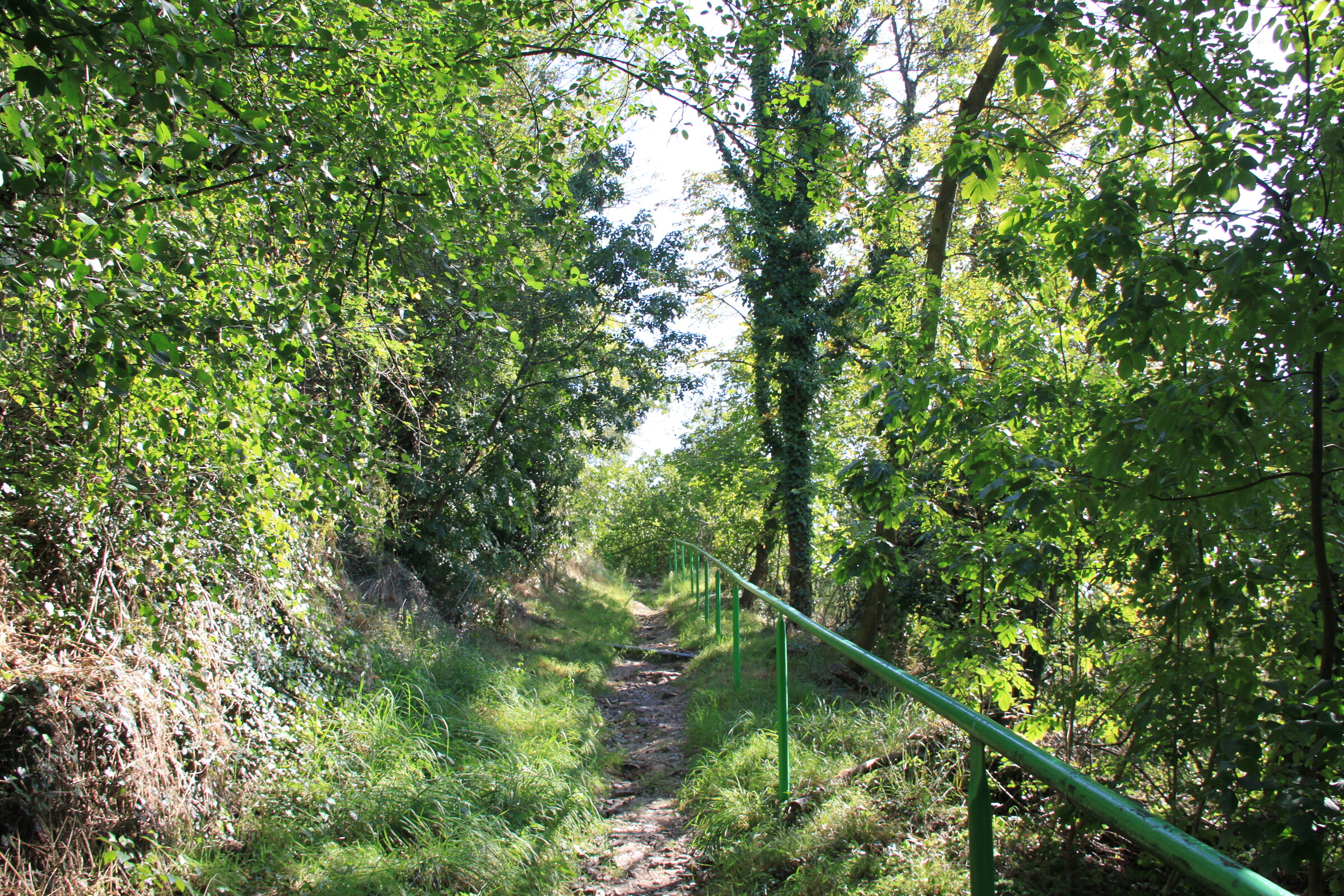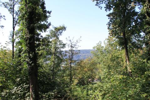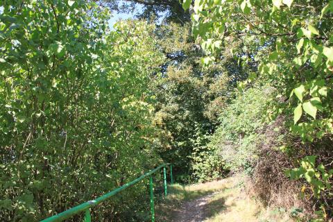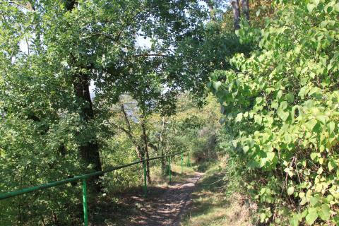 A narrower path, secured with a metal railing, winds up the mountain and put me on the right track this time. It winds back around at the top for a last good view of Arenfels and Bad Hönningn before continuing north.