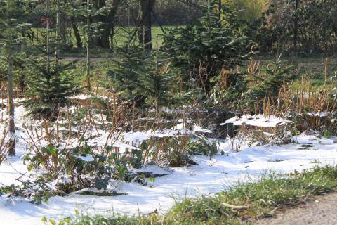A minor height difference caused water to run over an asphalt path from one small lake to the other—a shallow waterfall. Disks of ice clung to low branches, floating in the air.