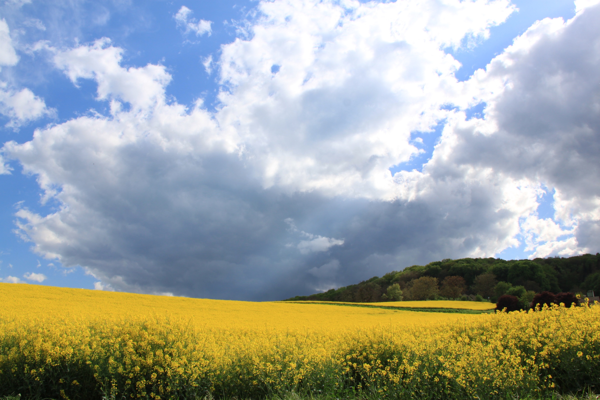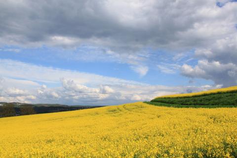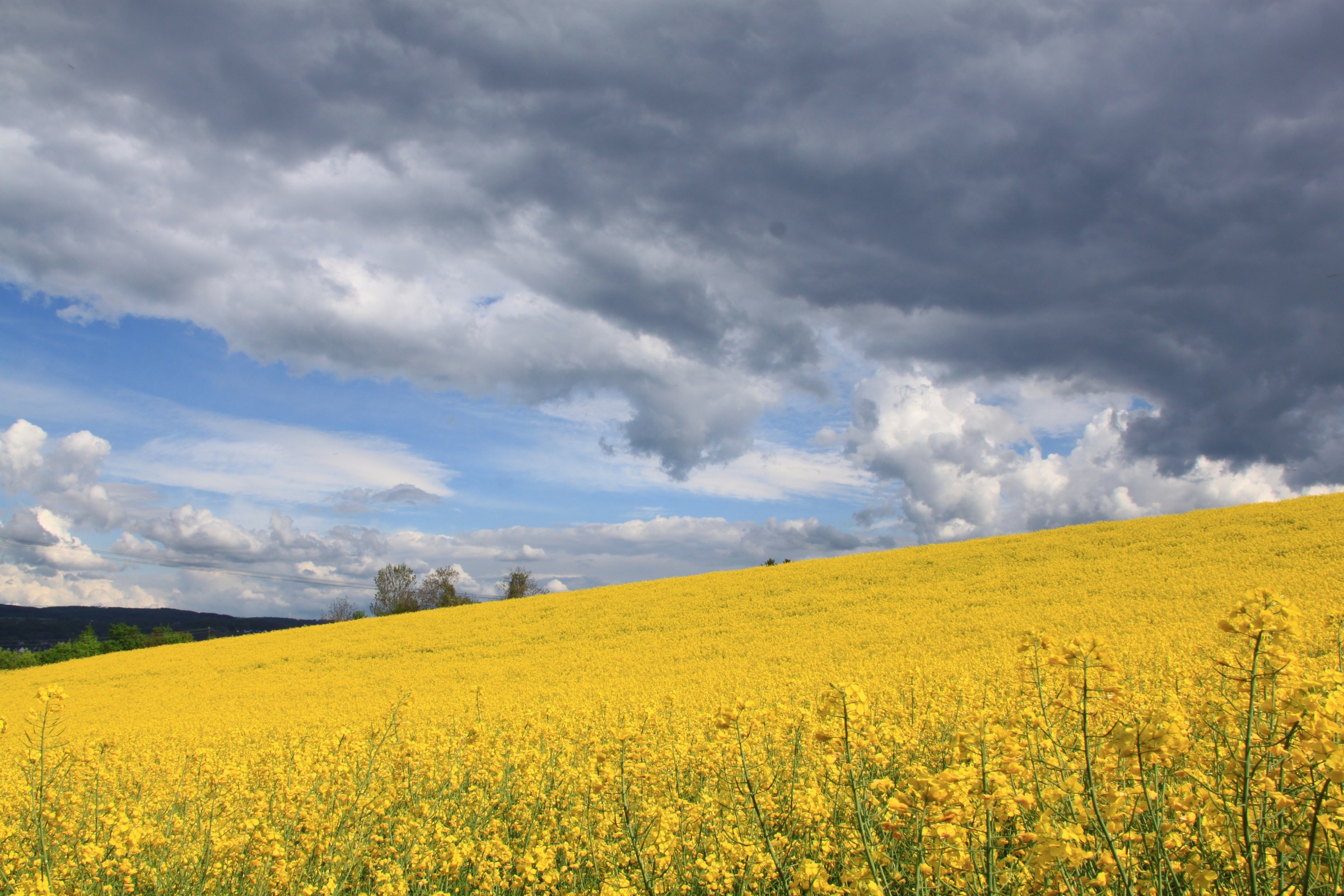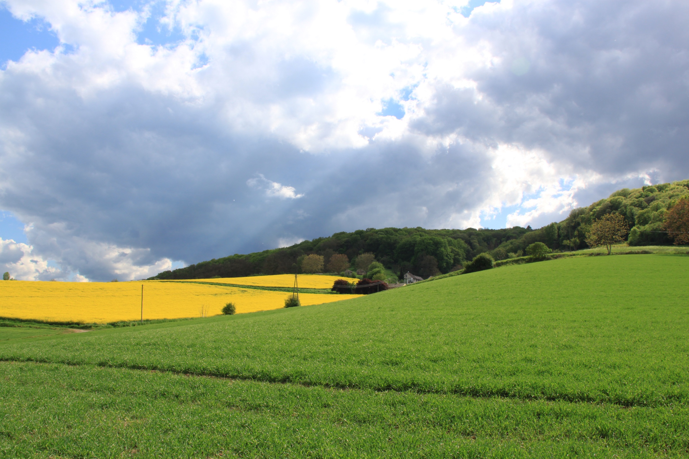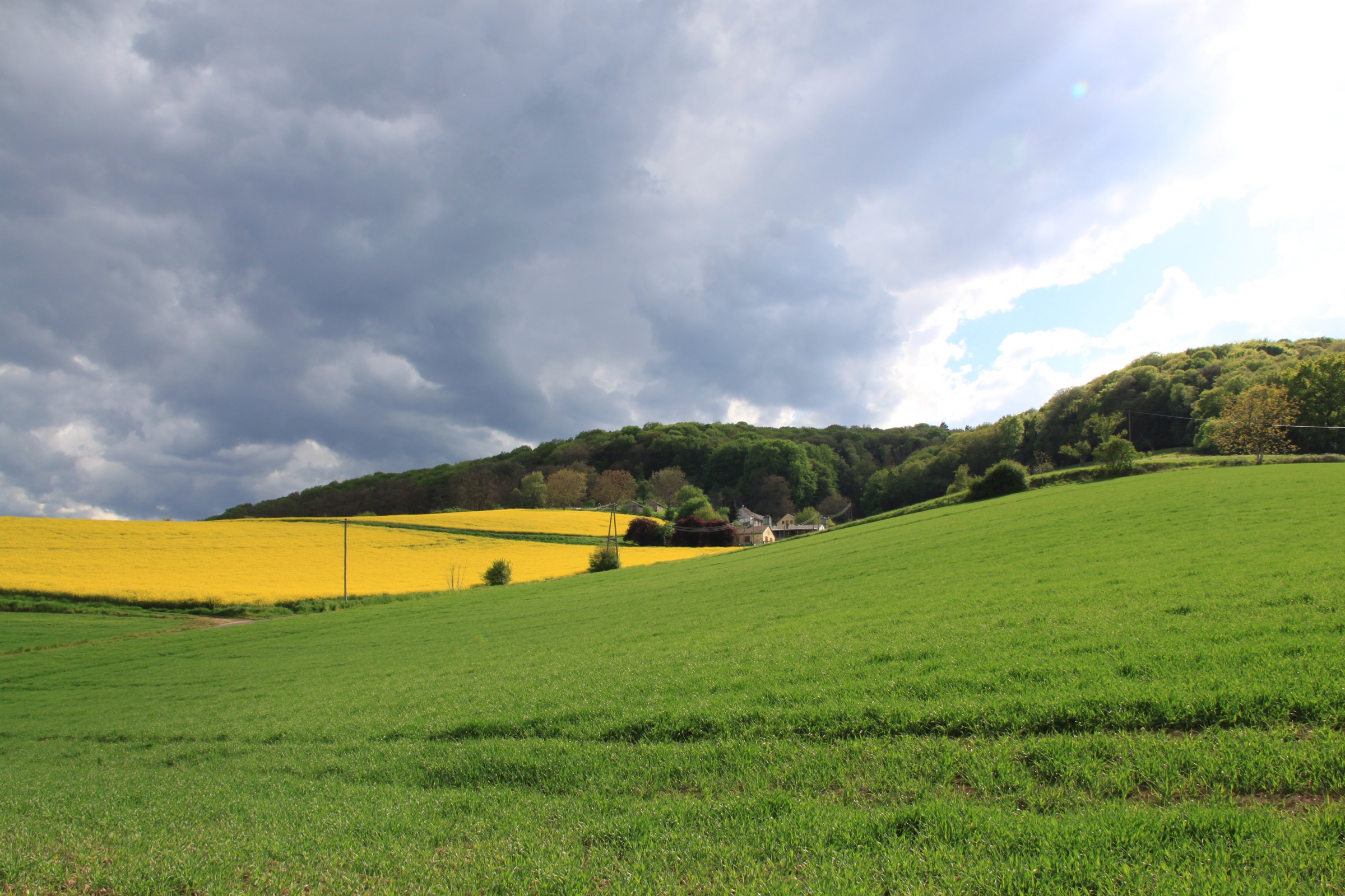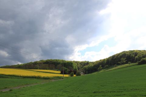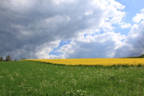 There's a certain uniformity to the fields that contrasts with the more complex shades and colours of the cloudy sky.