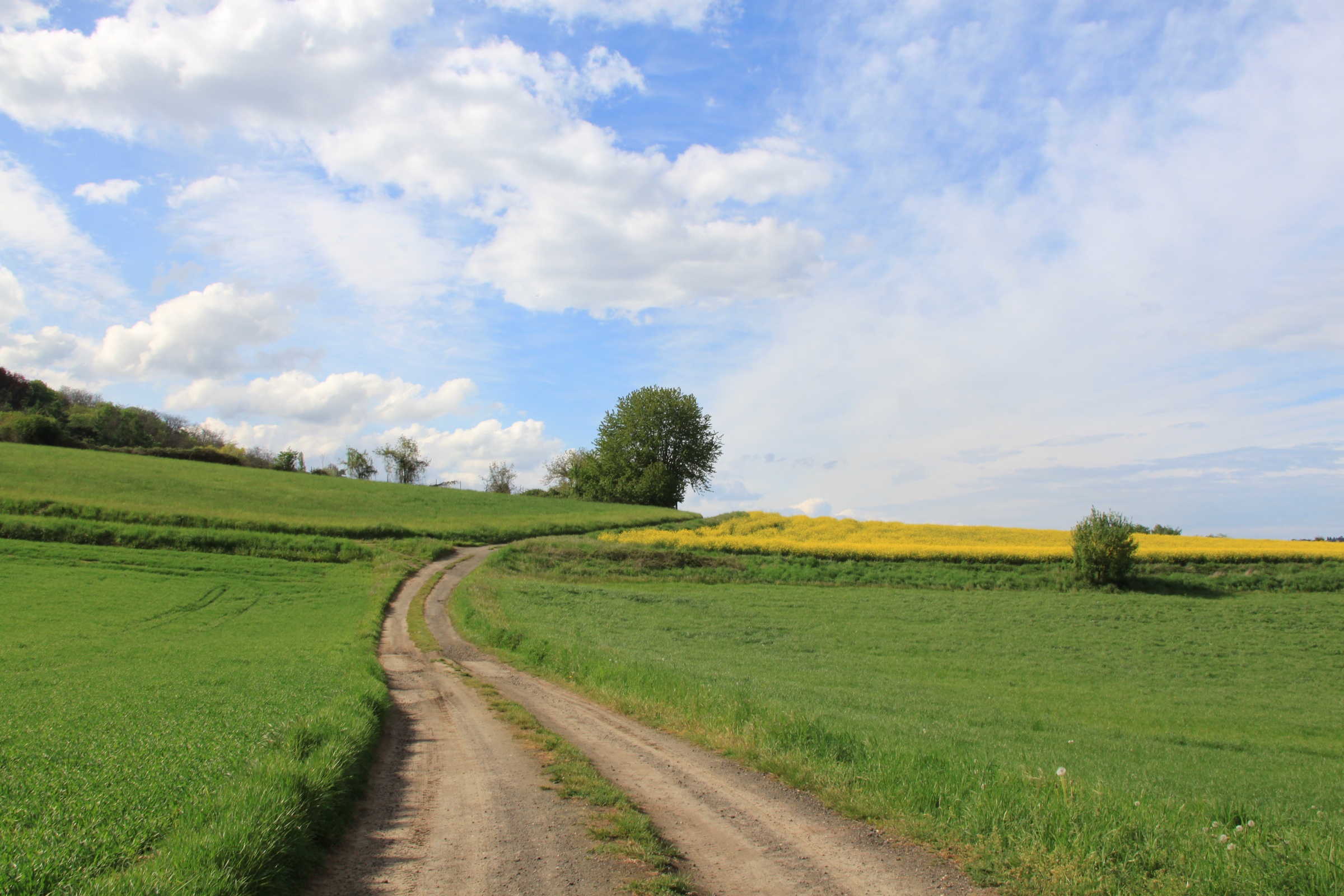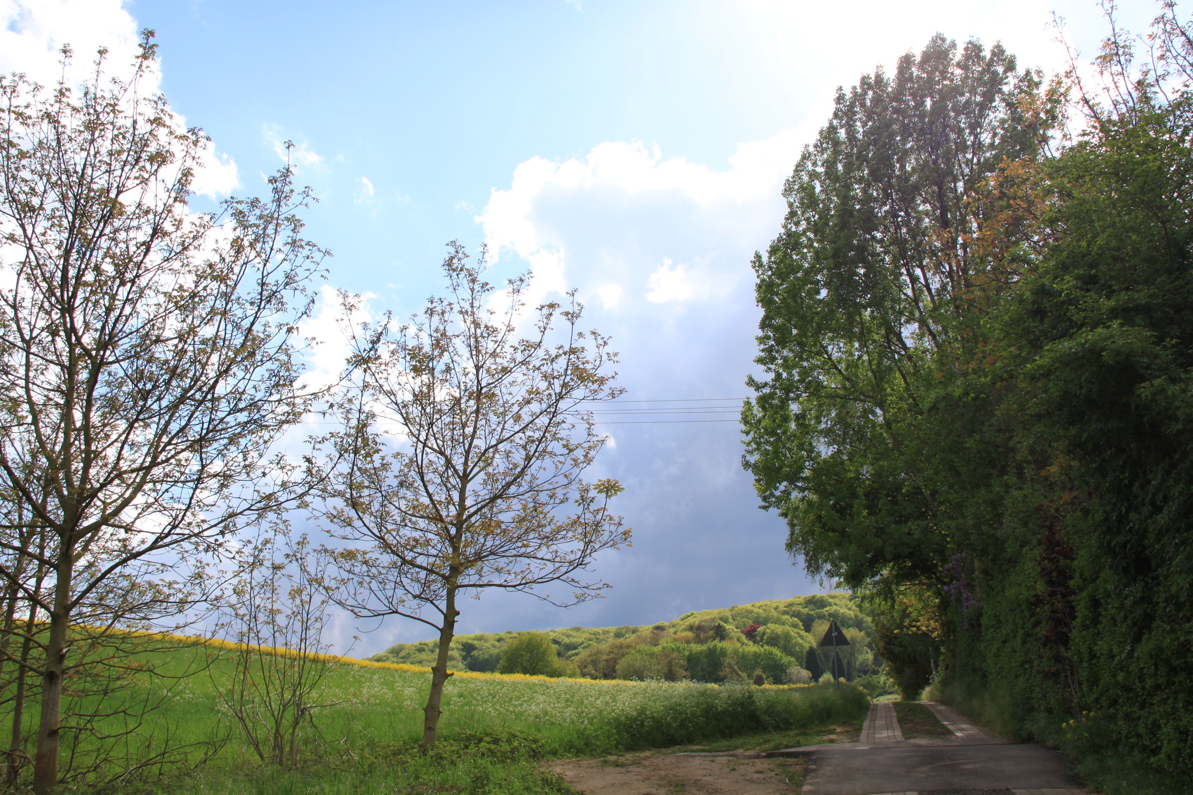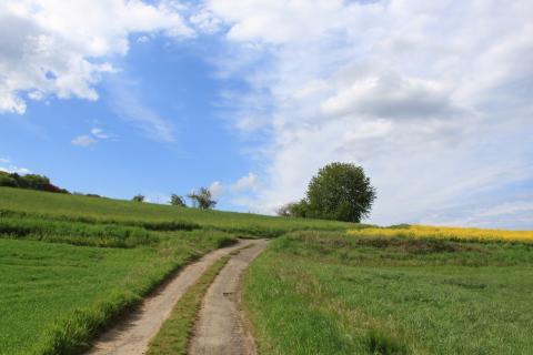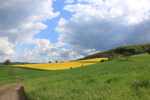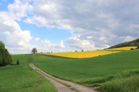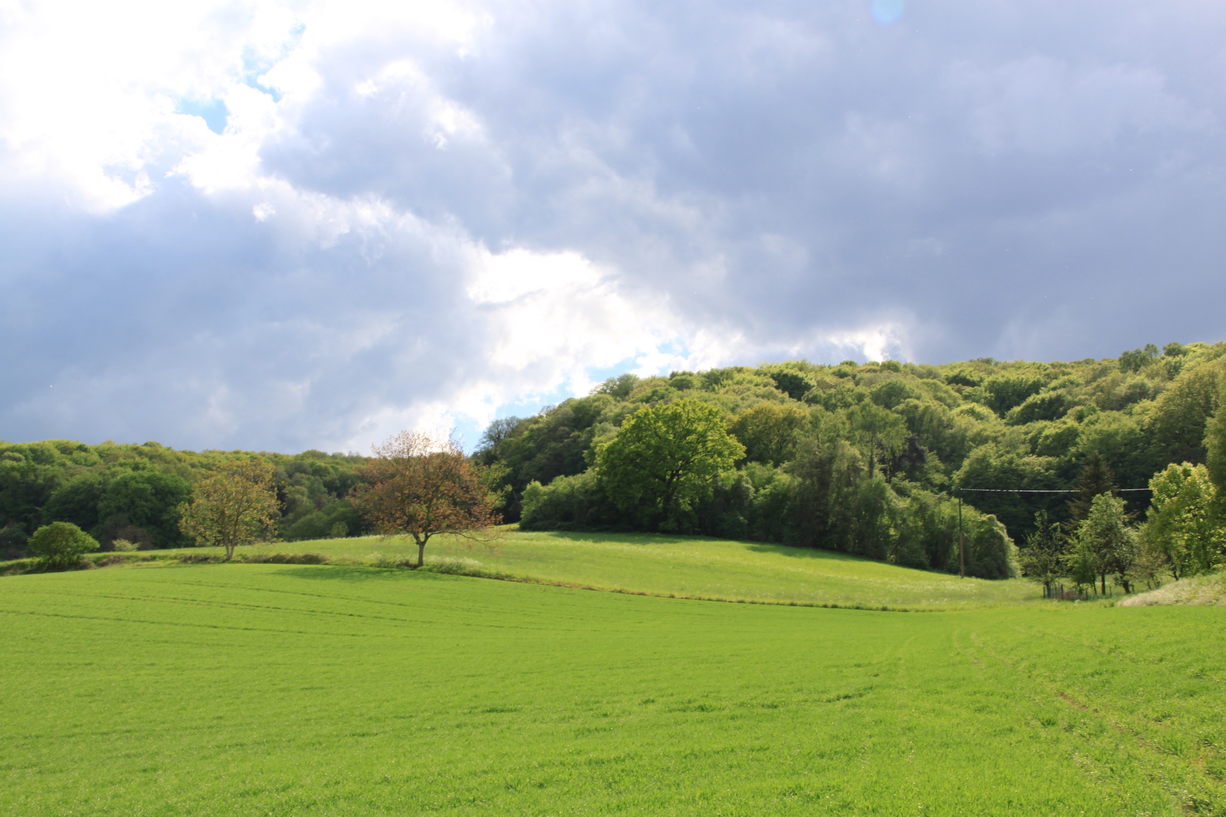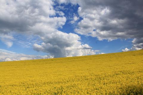 There's a certain uniformity to the fields that contrasts with the more complex shades and colours of the cloudy sky.
