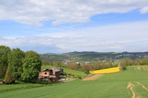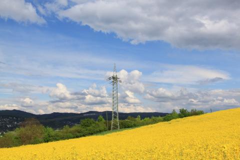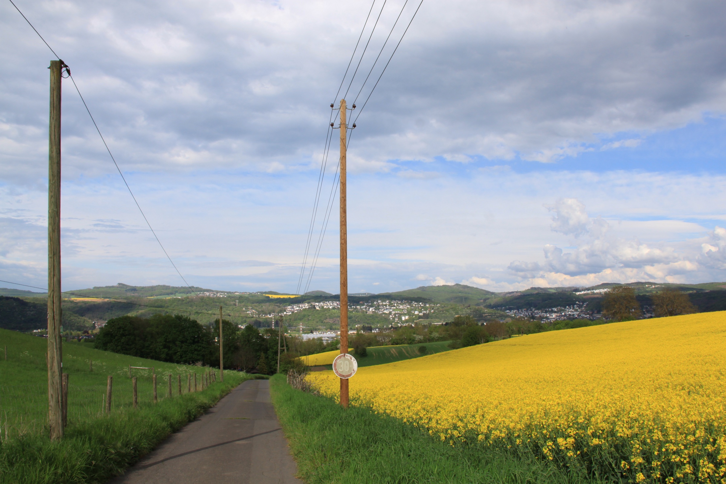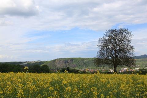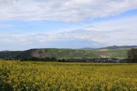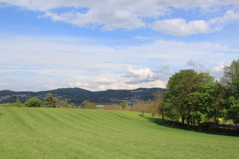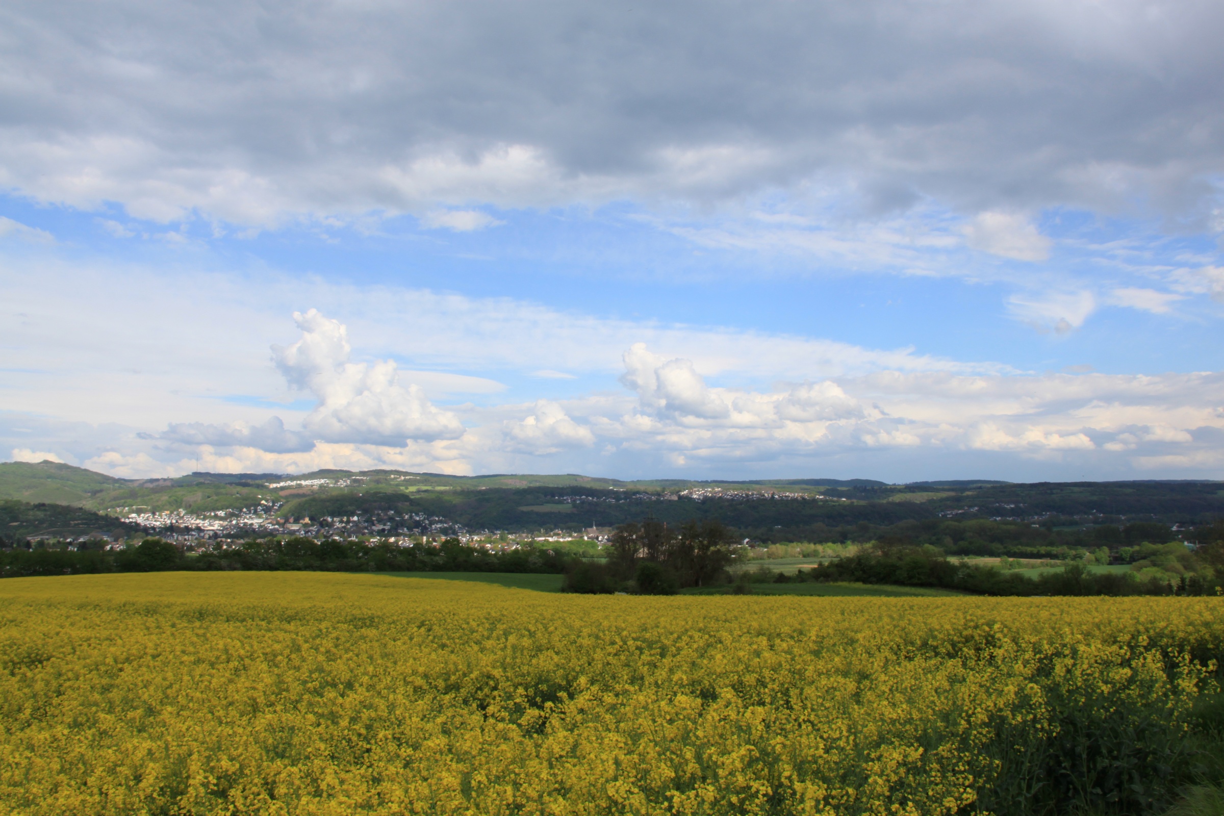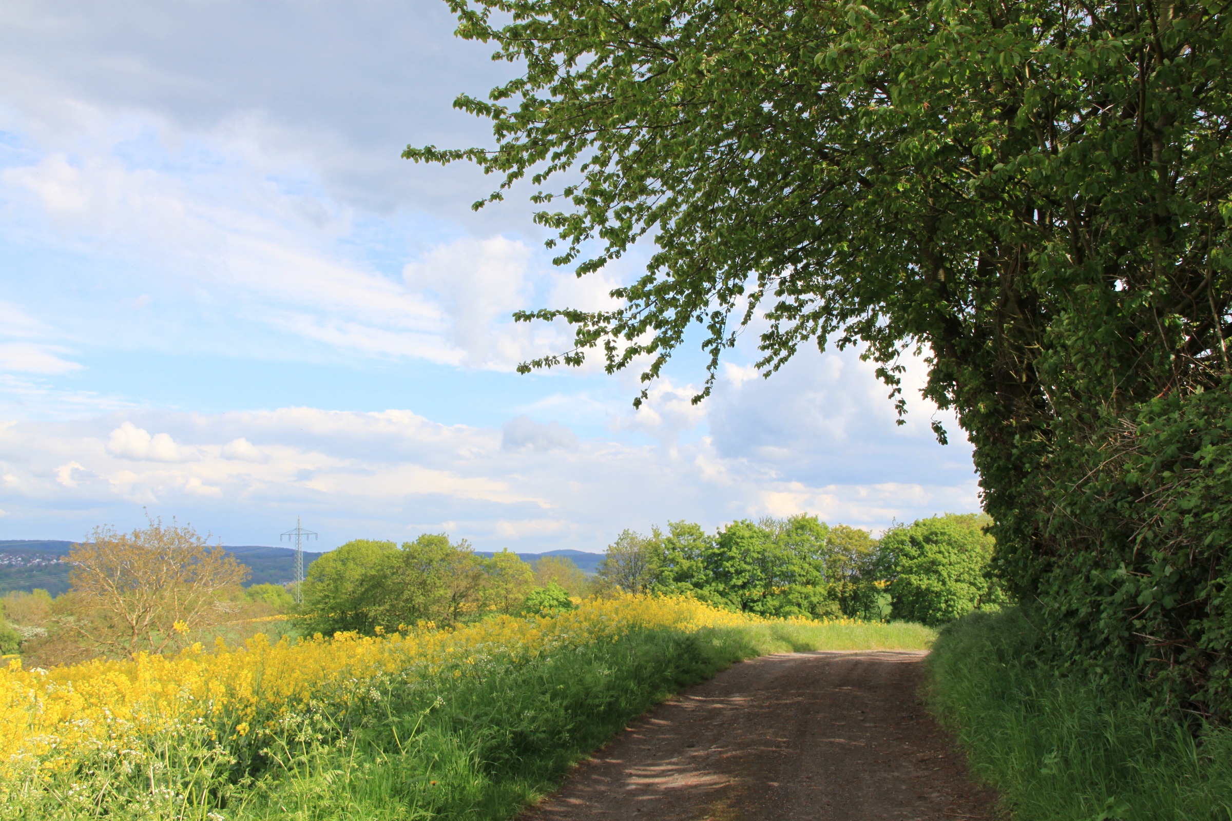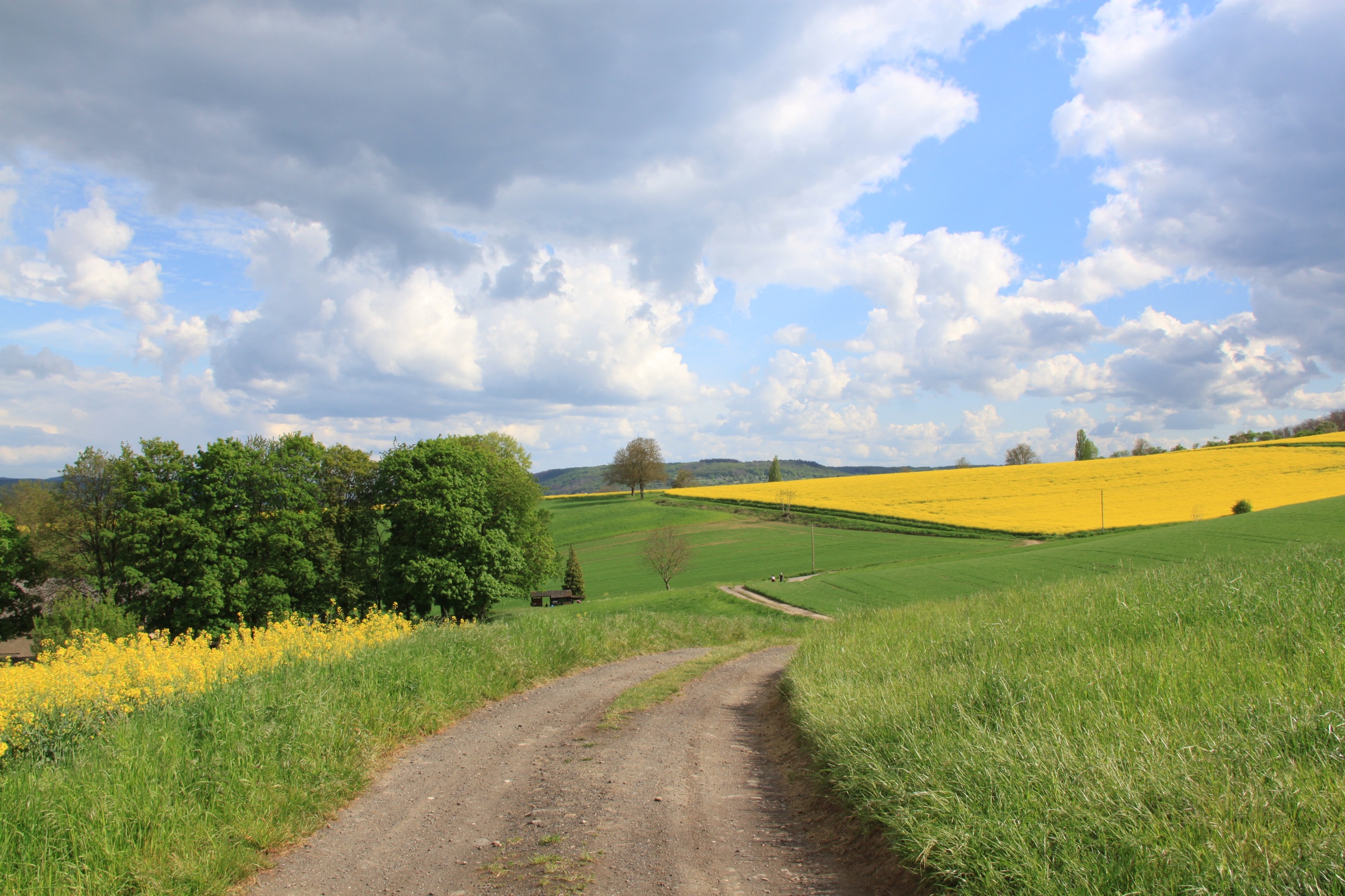 There's a certain uniformity to the fields that contrasts with the more complex shades and colours of the cloudy sky.