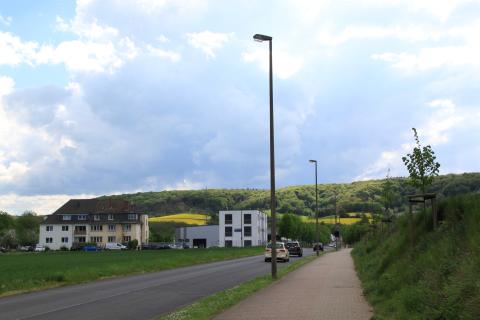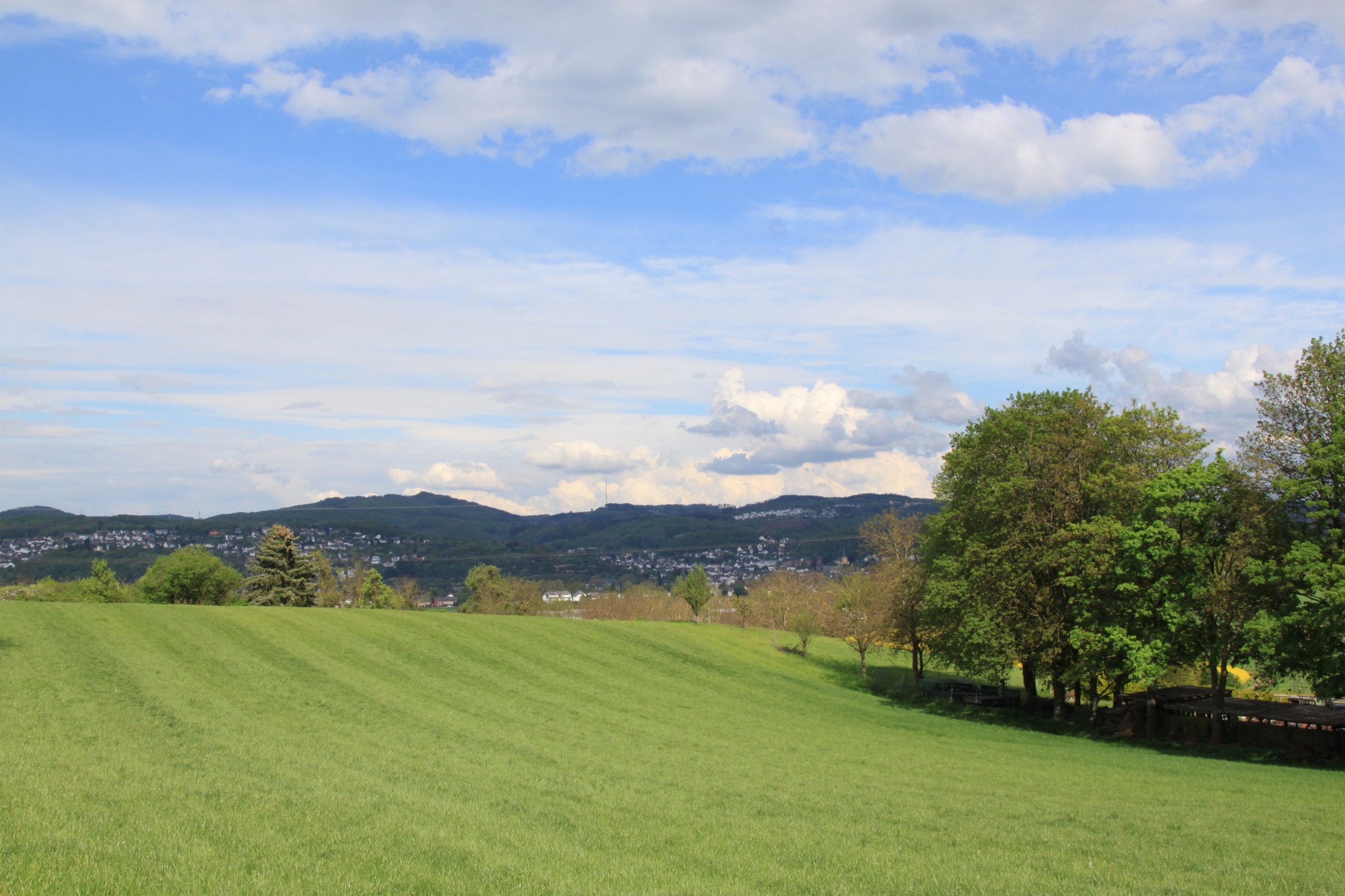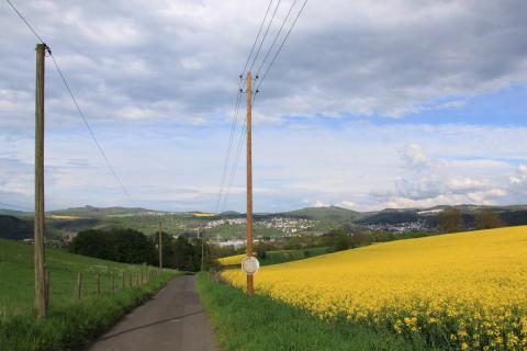 It outlines the slopes of the hills, standing out against the green grass and the forest.