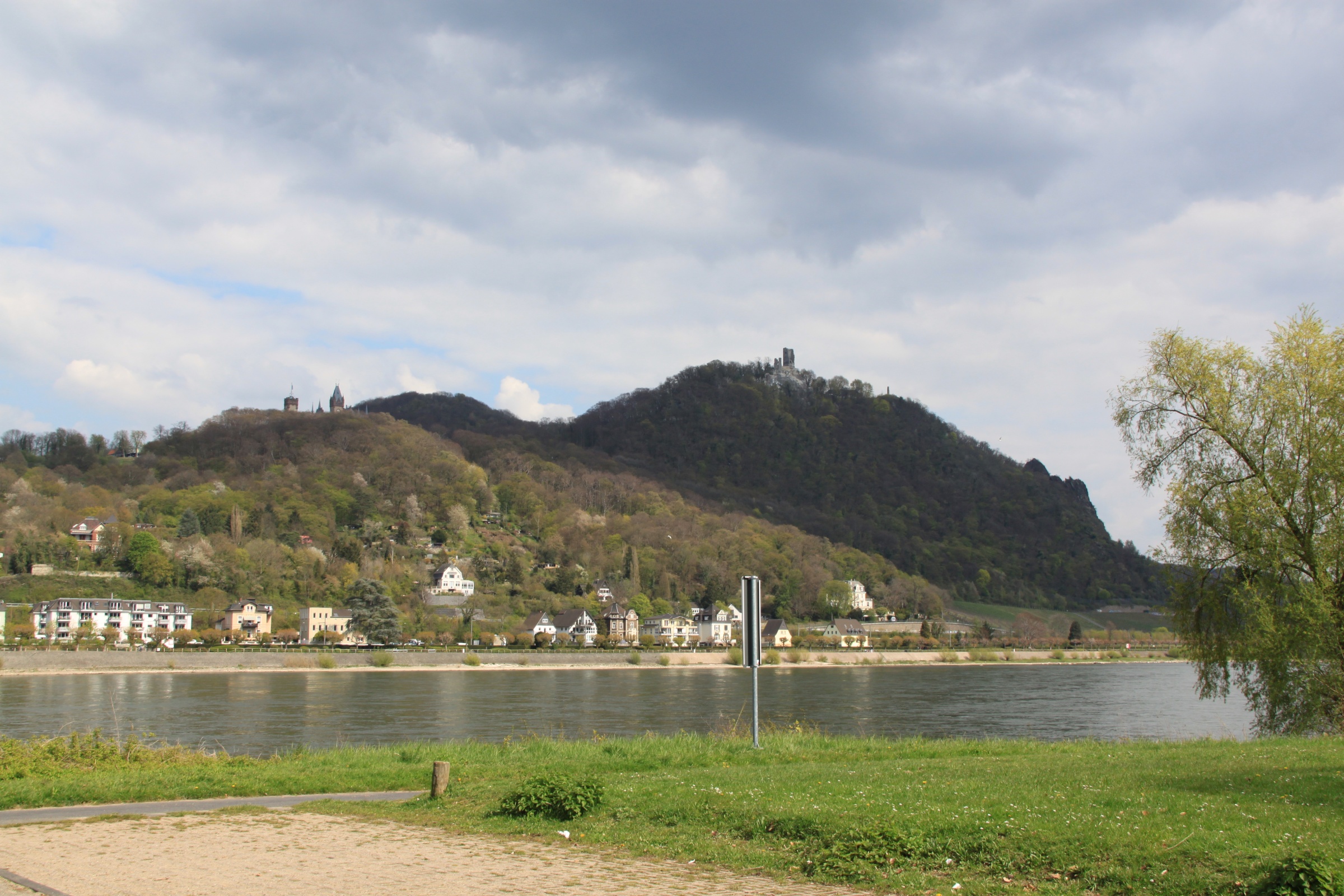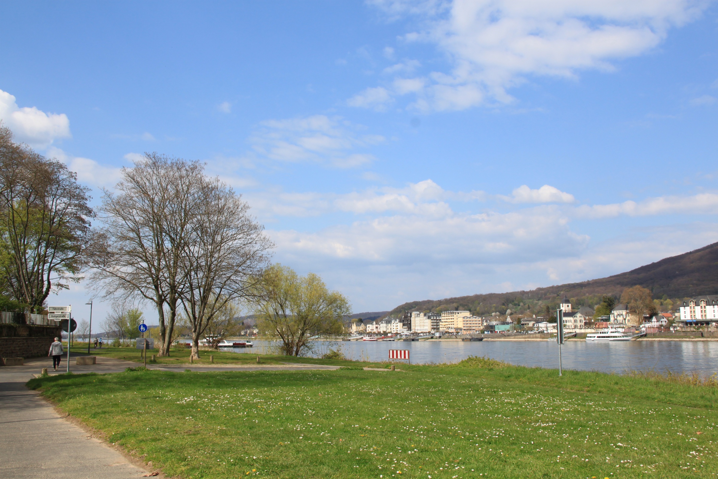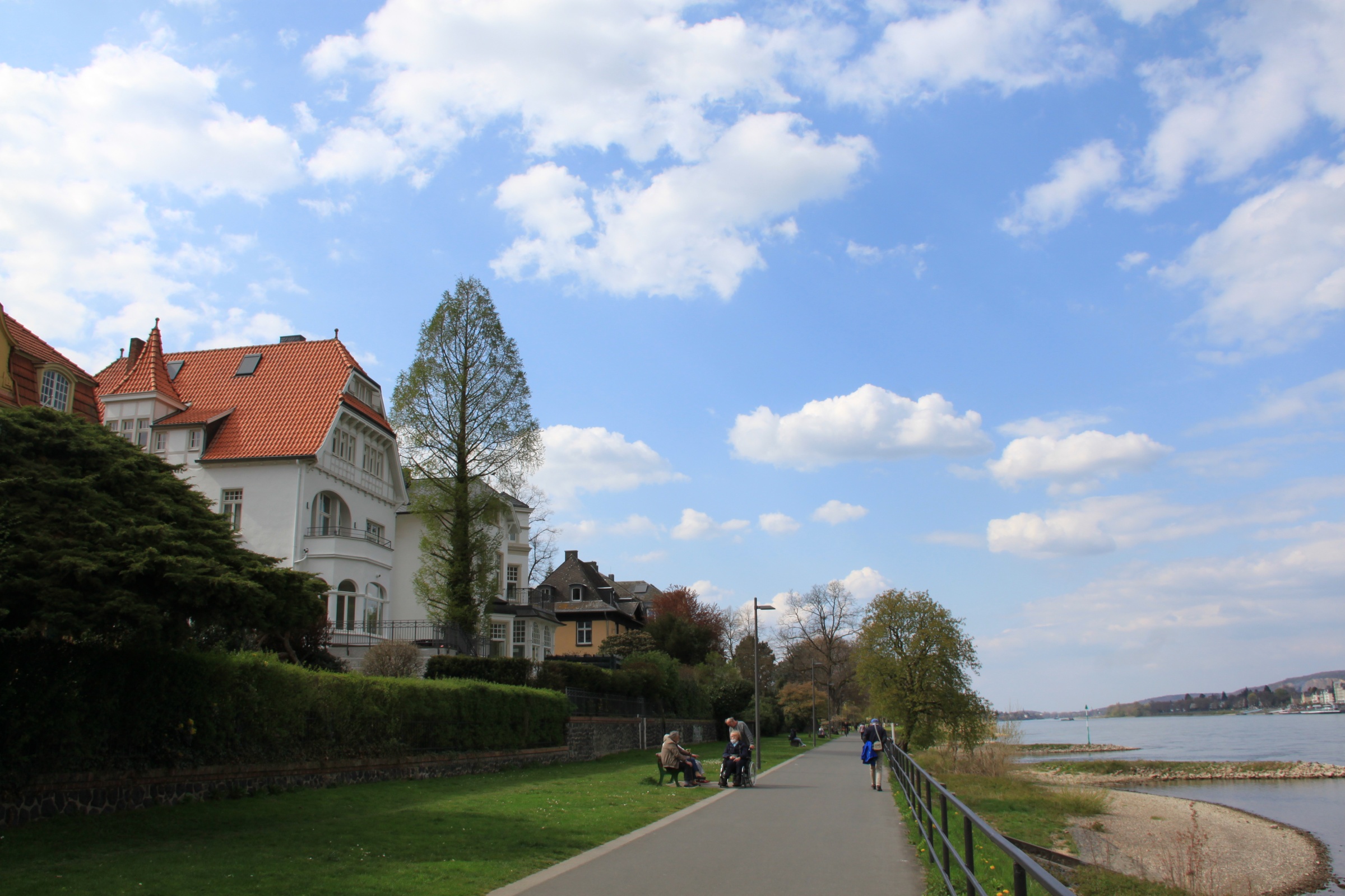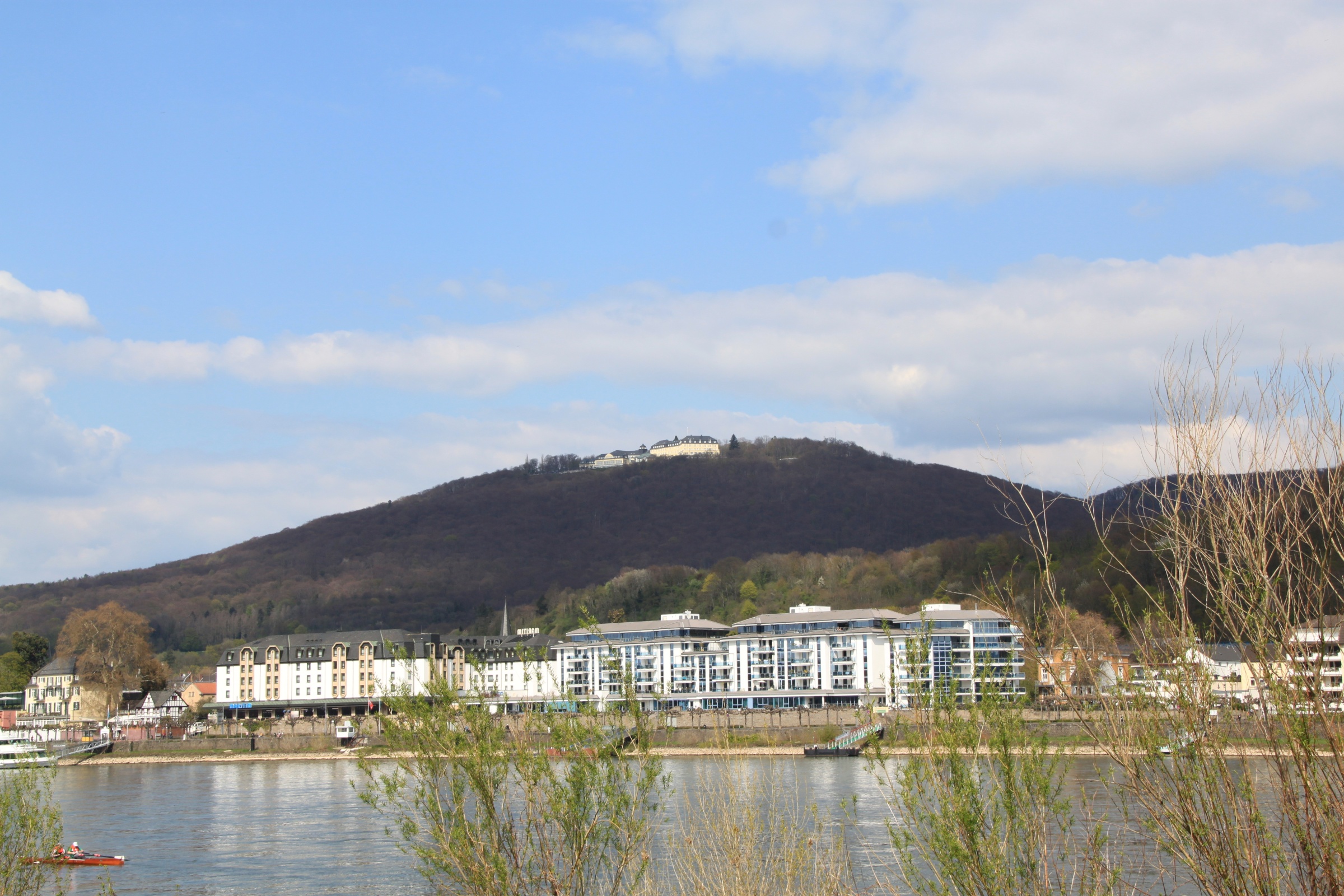 A broad promenade runs along the Rhine, flanked by 19th century villas looking upon the Drachenfels, the city of Königswinter, and the Hotel Petersberg above it.