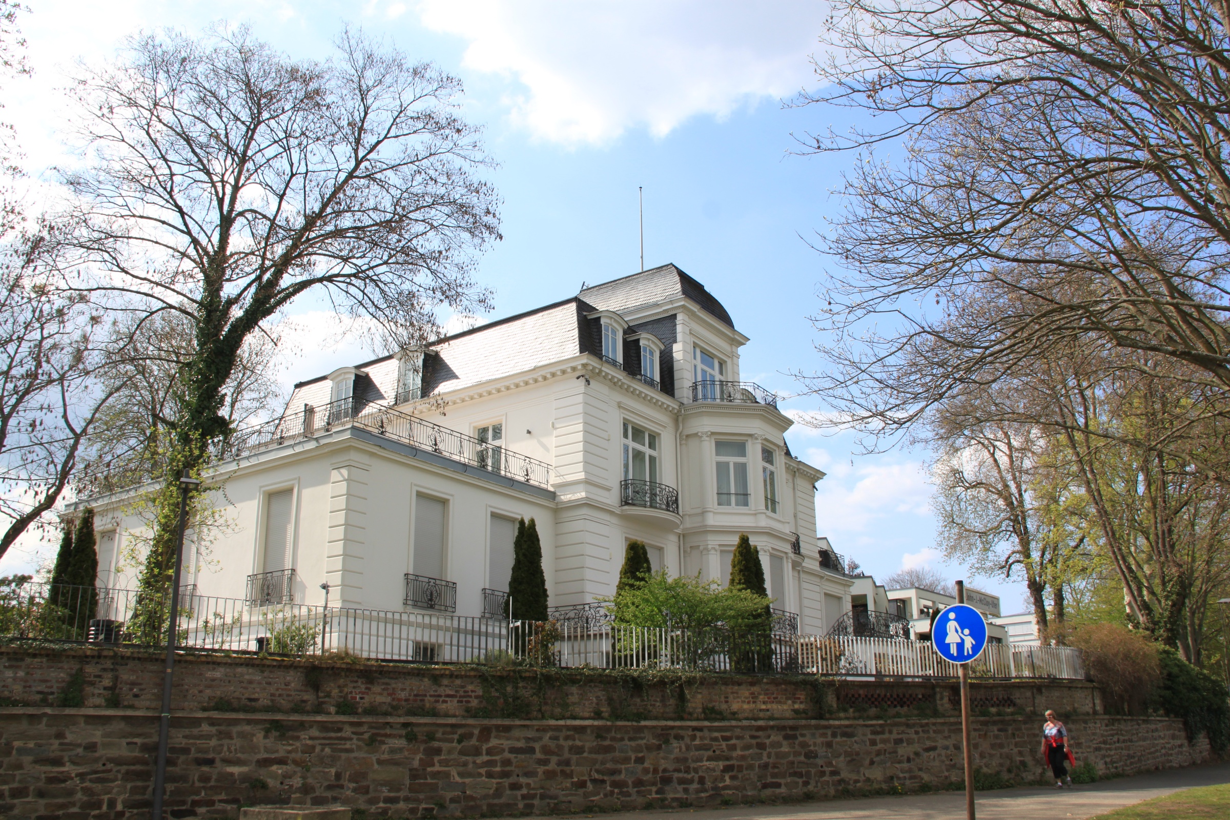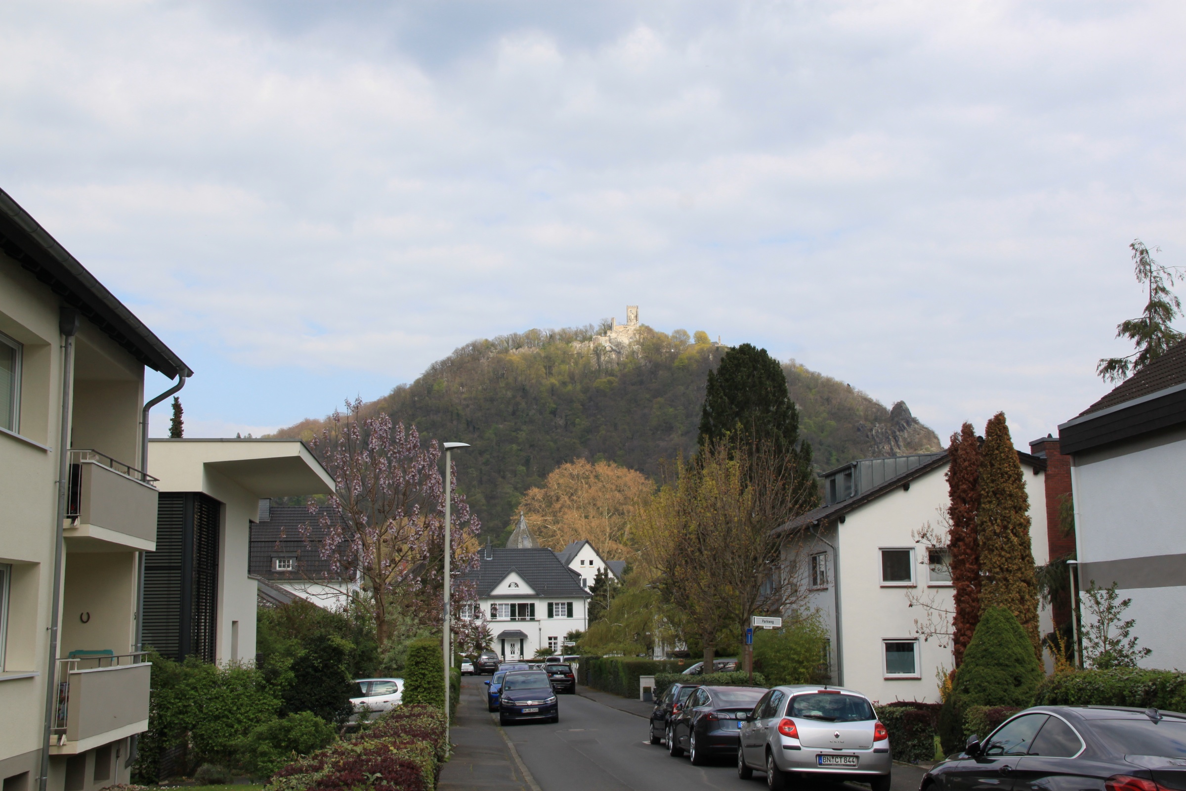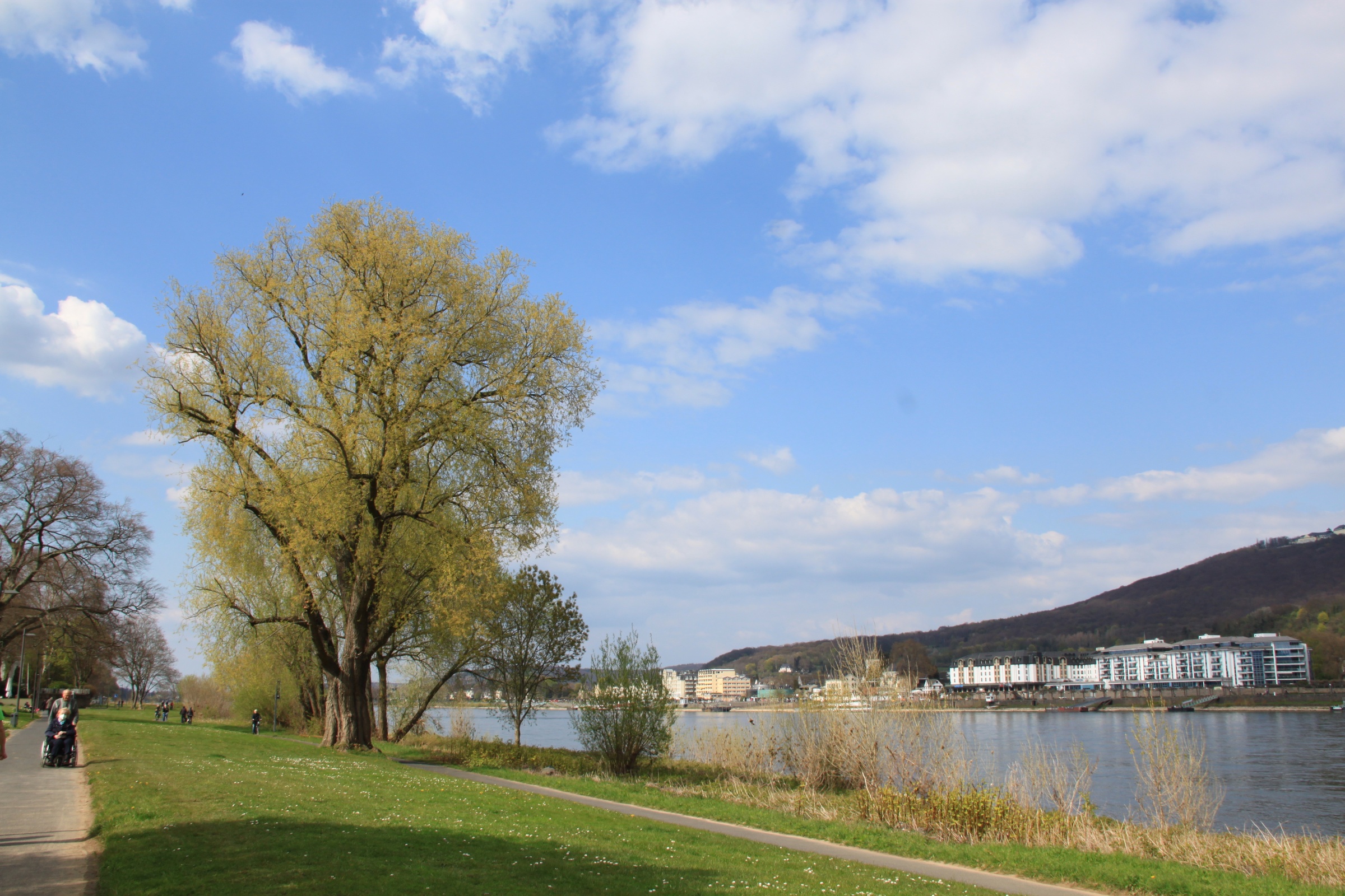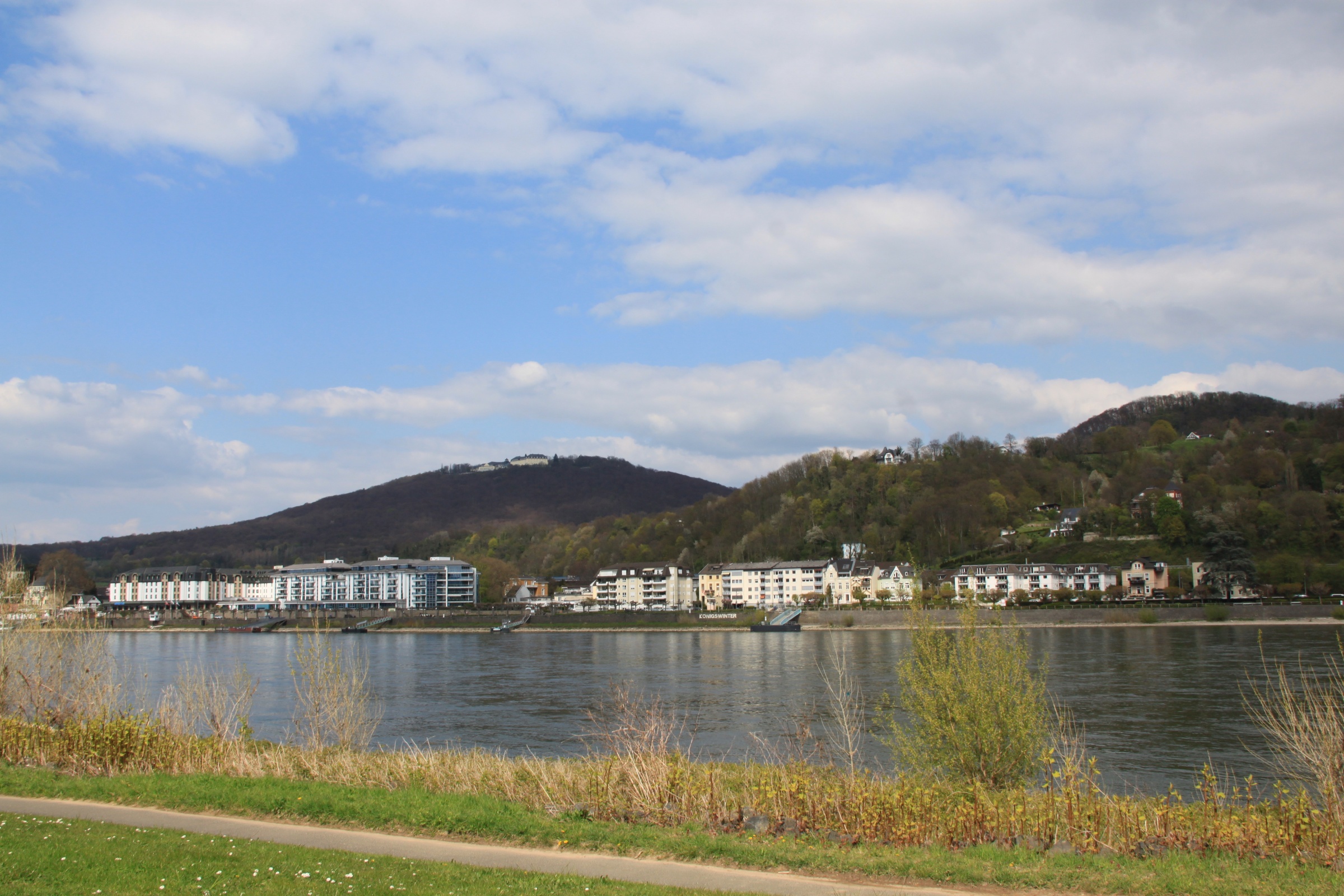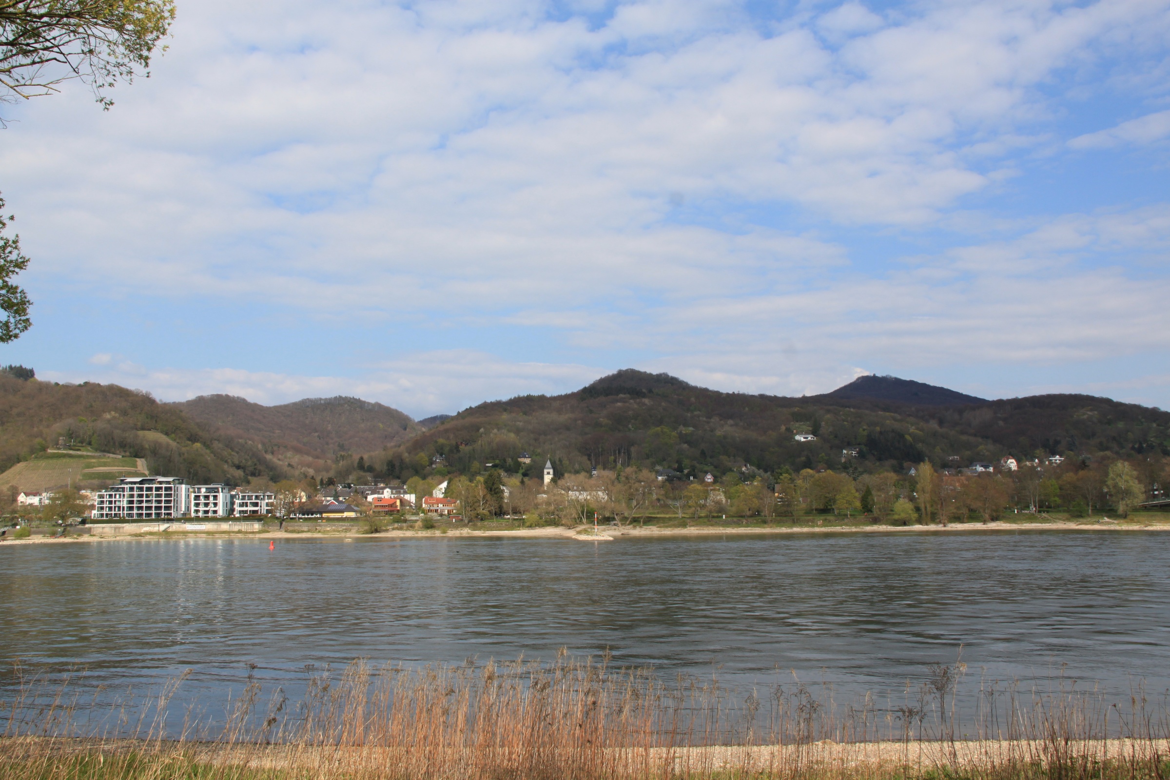 A broad promenade runs along the Rhine, flanked by 19th century villas looking upon the Drachenfels, the city of Königswinter, and the Hotel Petersberg above it.