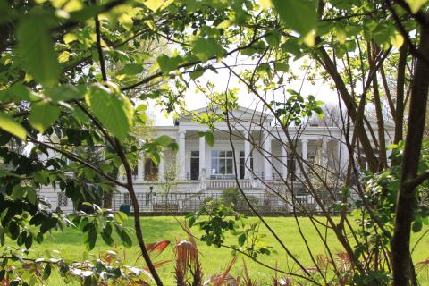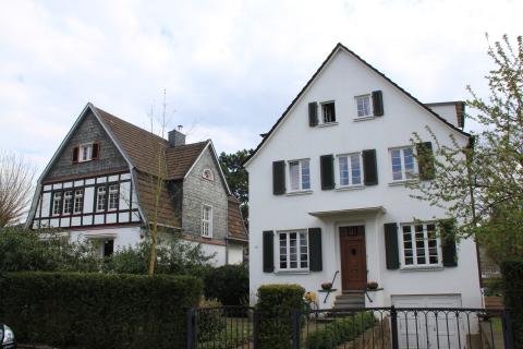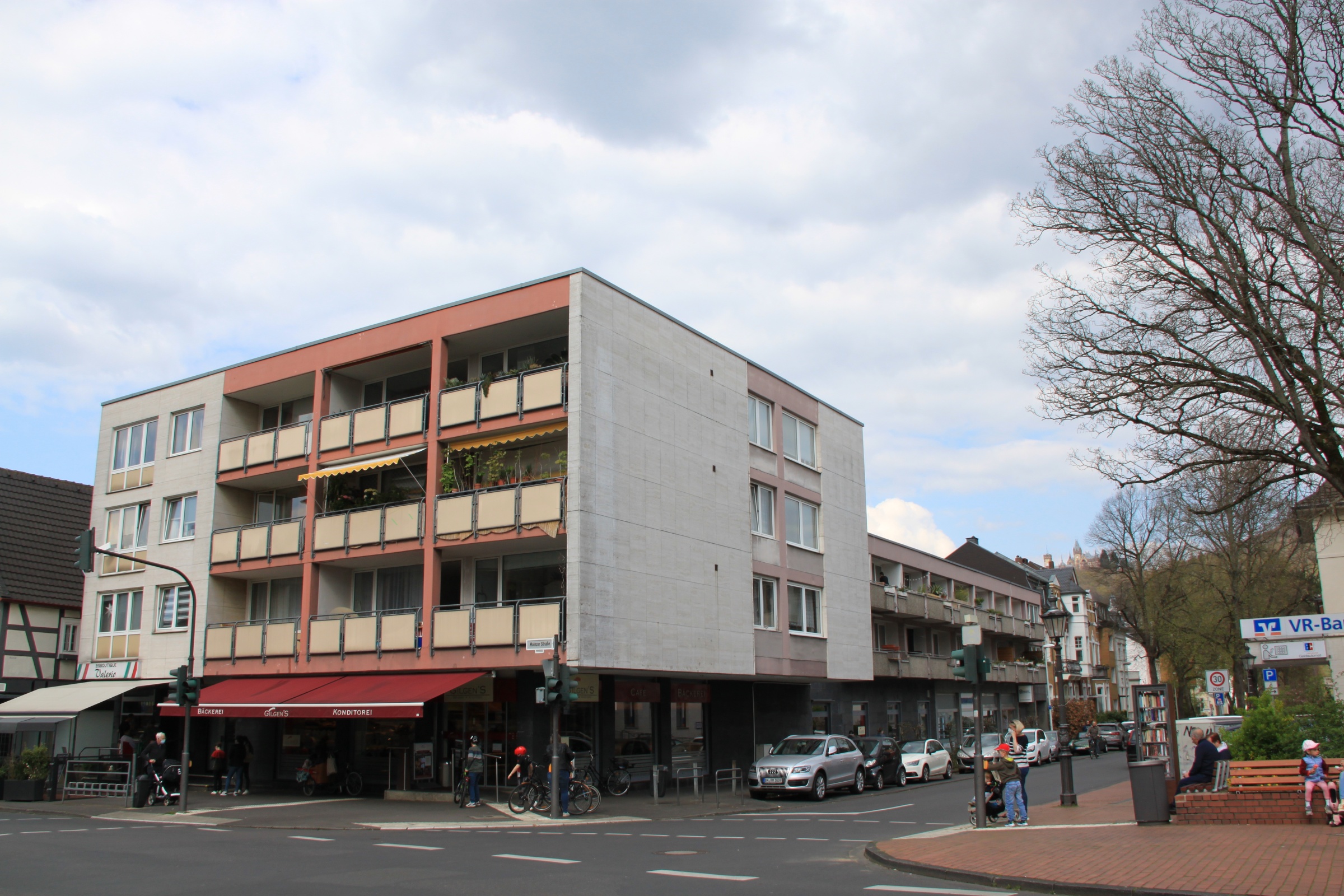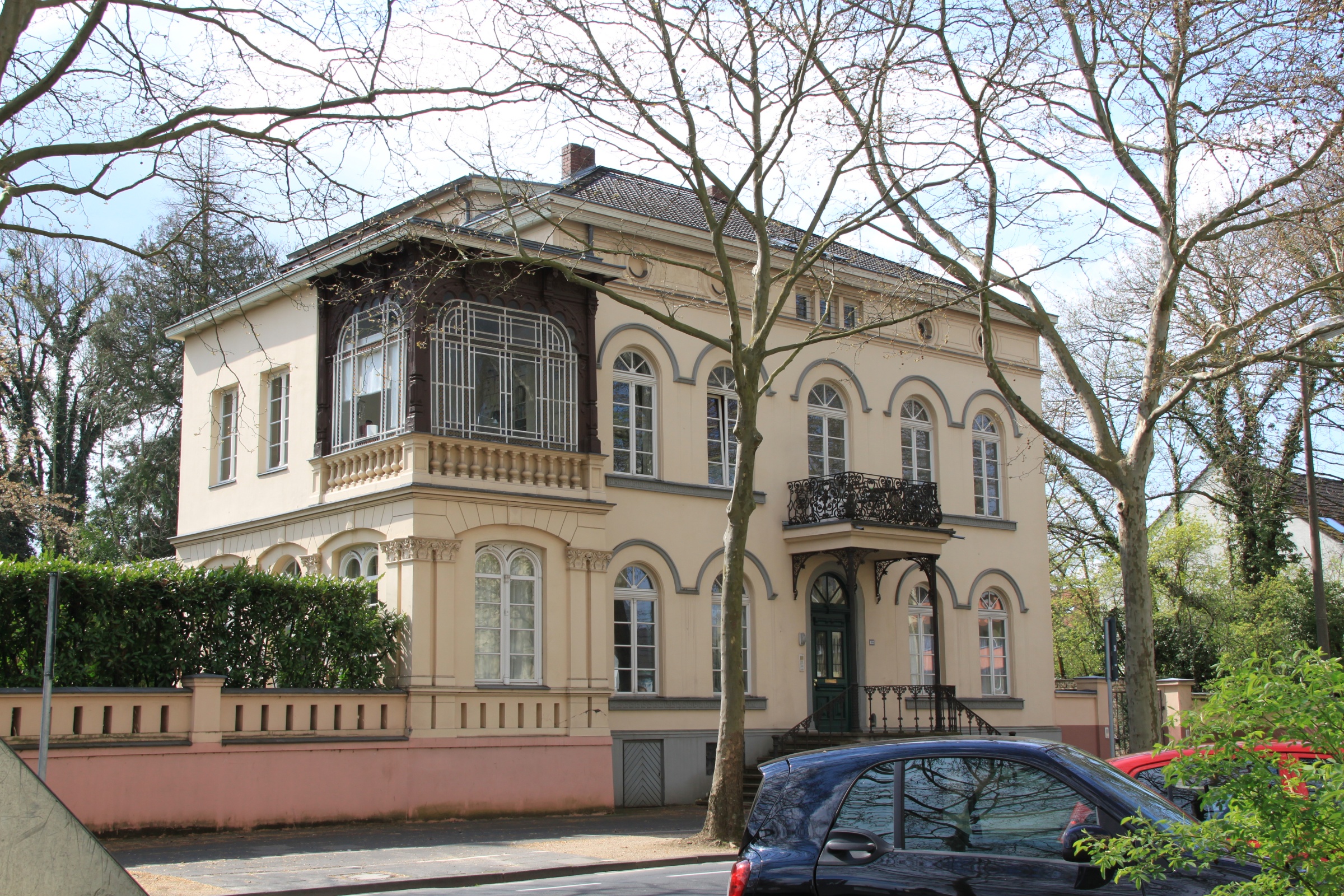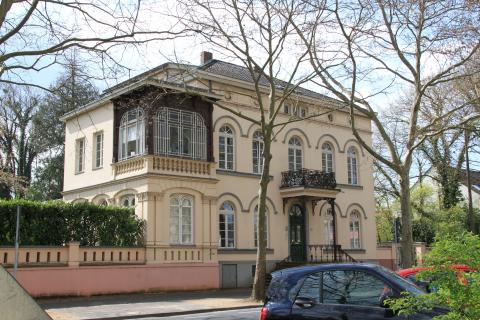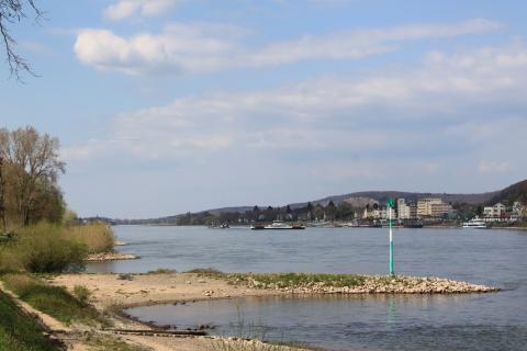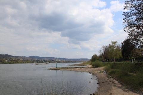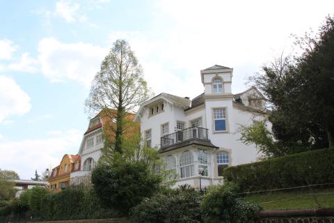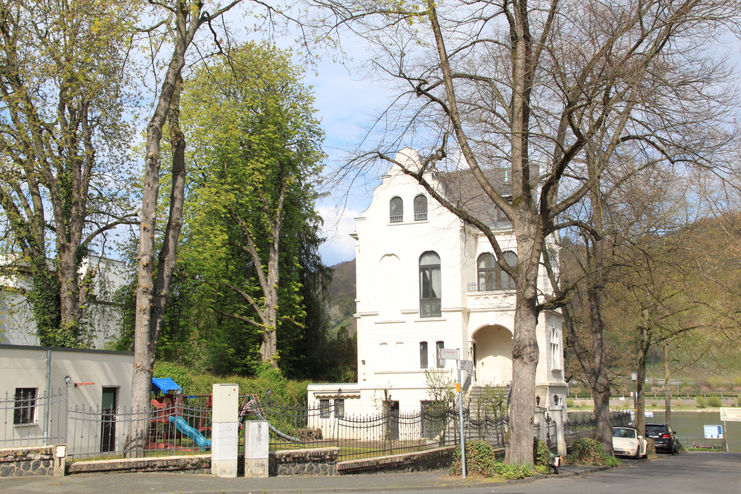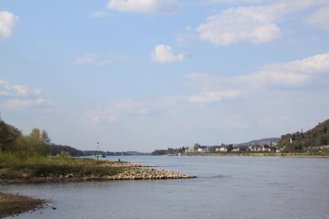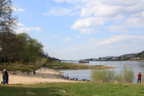 A broad promenade runs along the Rhine, flanked by 19th century villas looking upon the Drachenfels, the city of Königswinter, and the Hotel Petersberg above it.