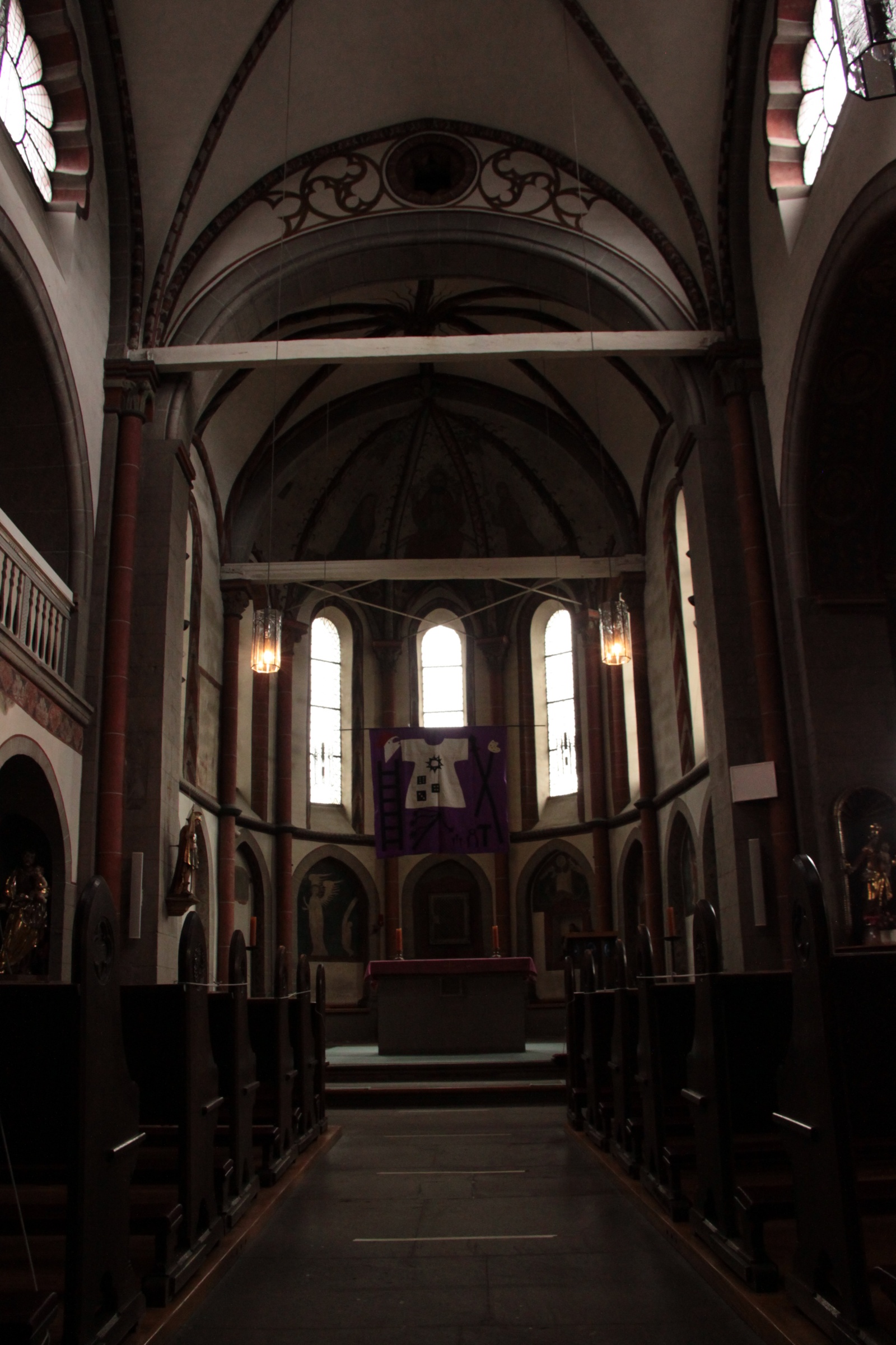 The Romanesque church from the 11th century, rich in centuries worth of frescoes and statues, is accompanied by a small baroque chapel of like colour scheme.