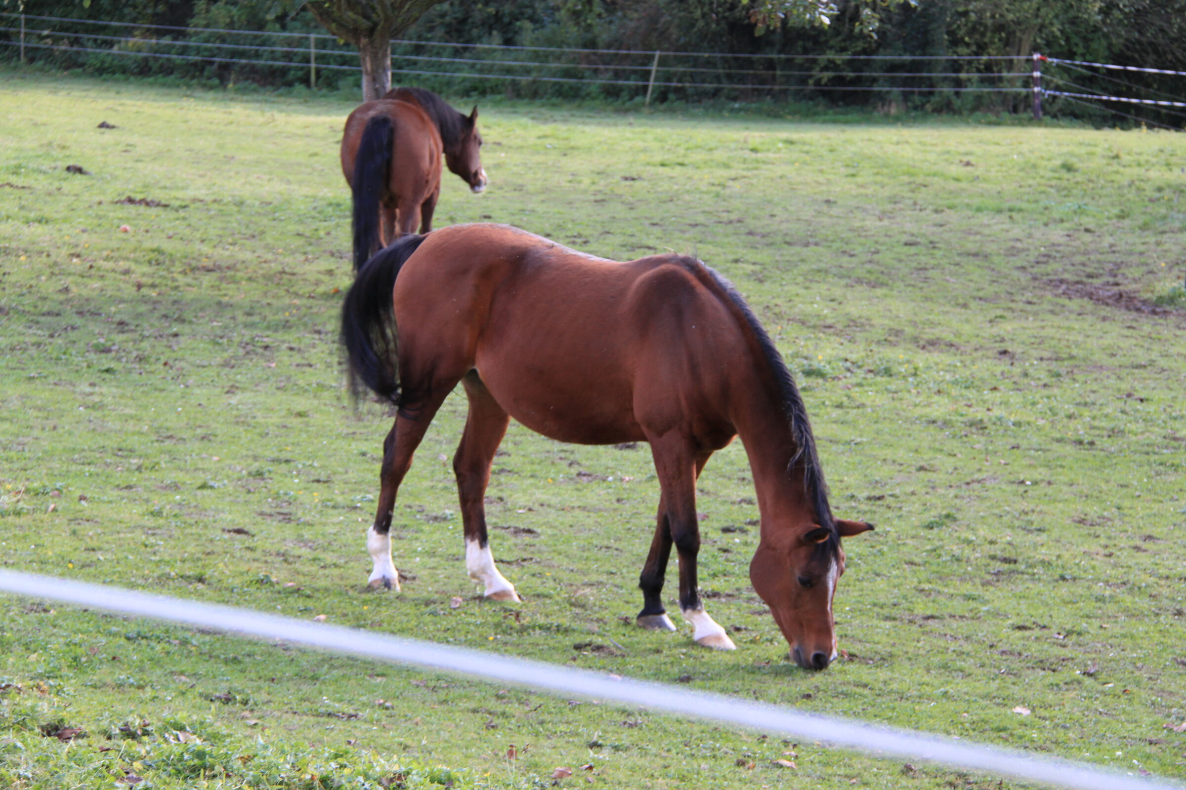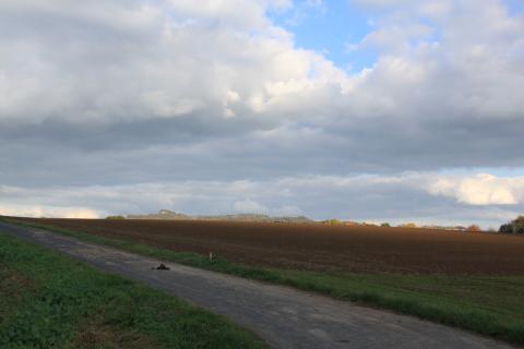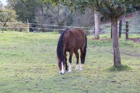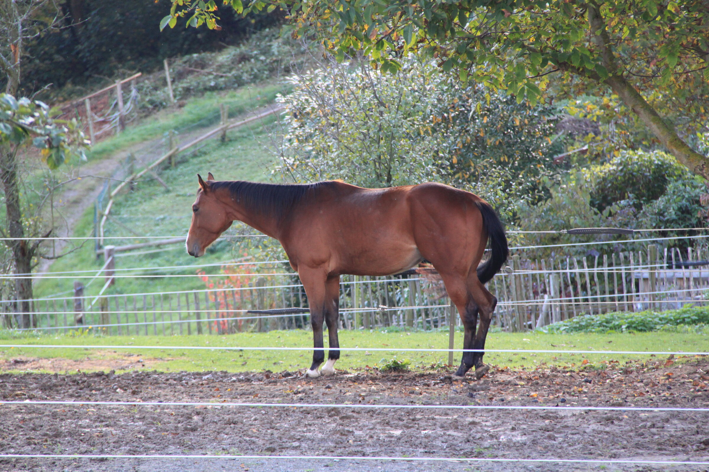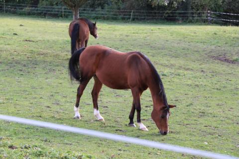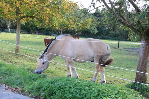 Behind the village, at the edge of the valley, lies a small horse farm (with a pair of sheep, too). The land flattens beyond here and gives way to open fields and woodland.