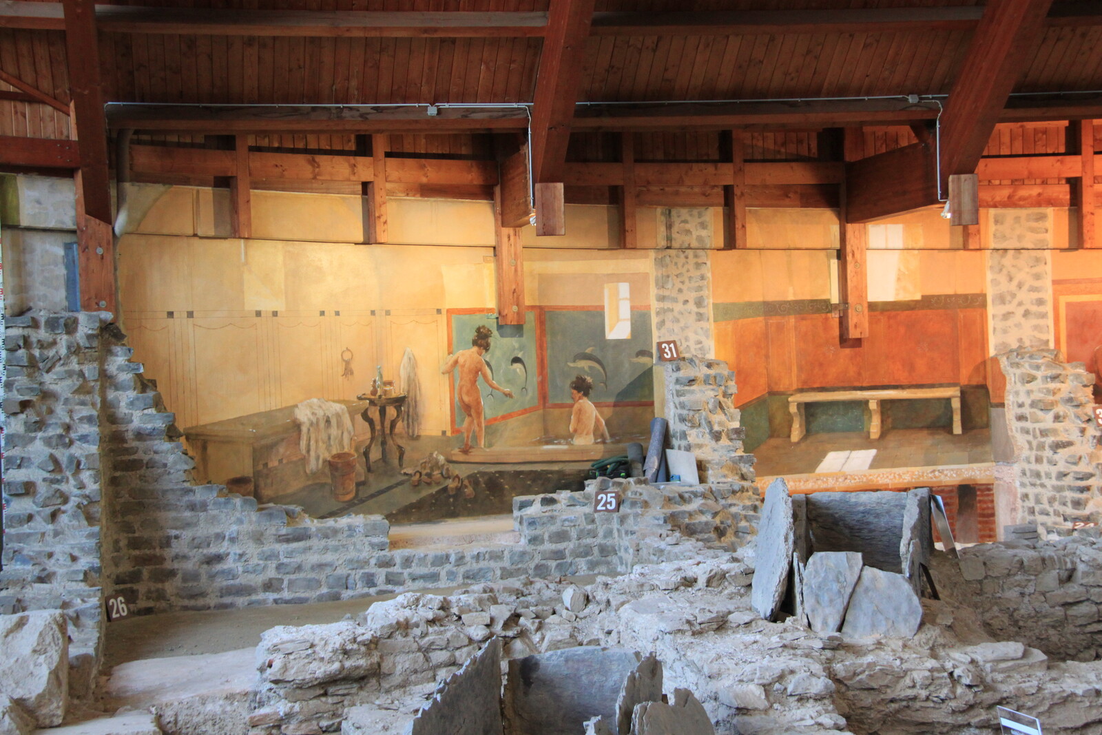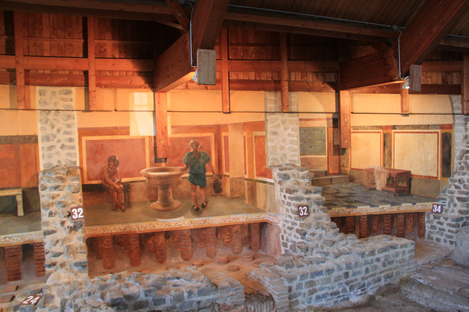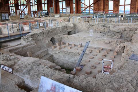 The basement is partially exposed, showing the channels and chambers for the hypocaust, maintenance staircases, and water channels.