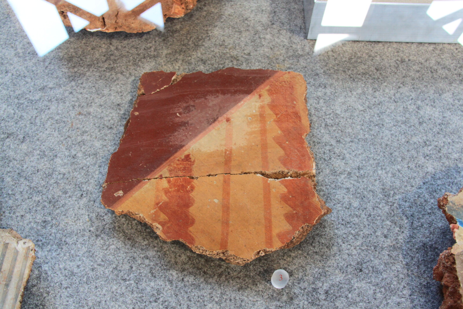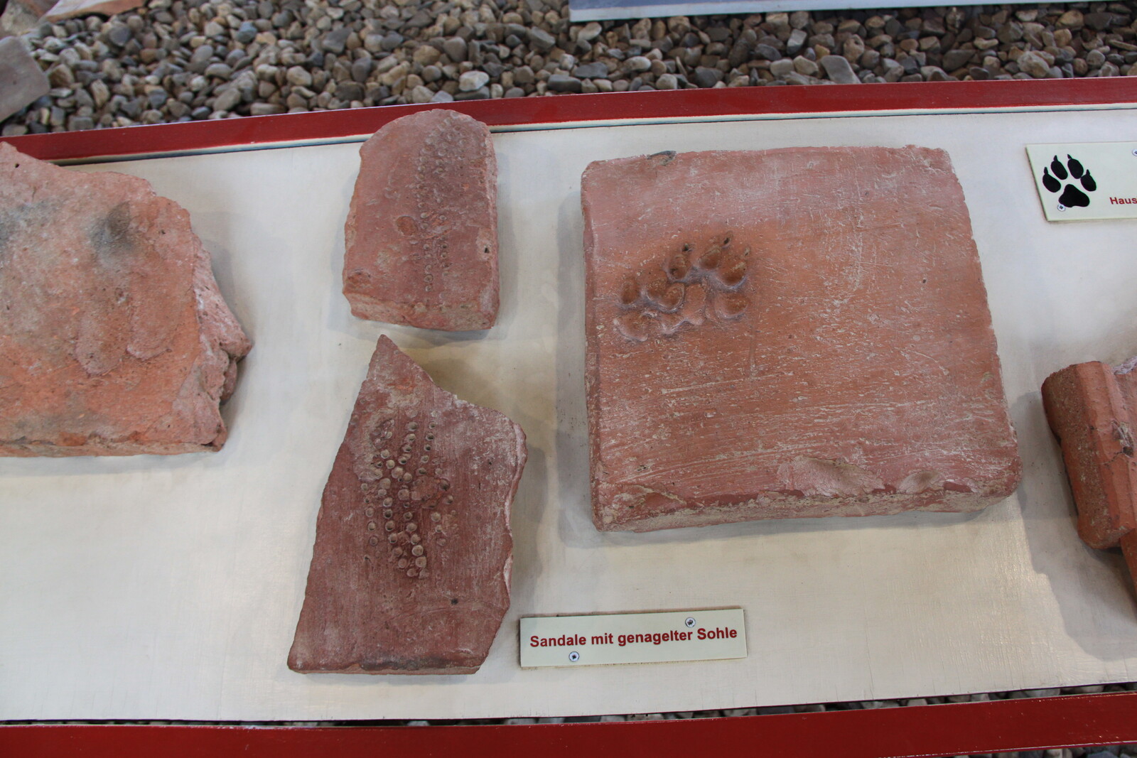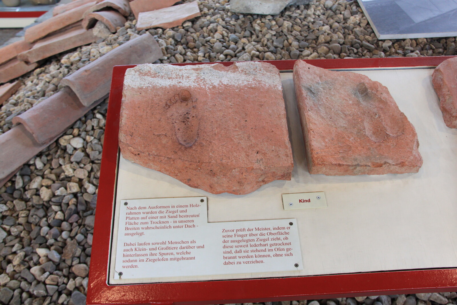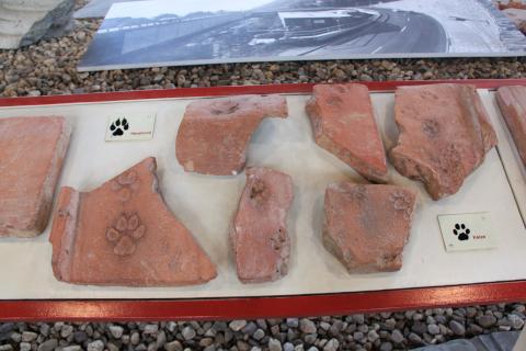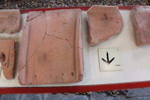 Ceramic tiles for the roof and eslewehre were left out in the sun to dry before firing. The footprints of children, pets, and other animals became immortalised in them.