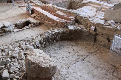 An adjacent building housed the baths: a heated room for undressing, a warm bath, a hot bath, and an unheated room for gymnastics, as well as a toilet flushed by a local stream. The building was destroyed in a landslide a few centuries later, and parts of it were used as a Christian cemetary afterwards.
