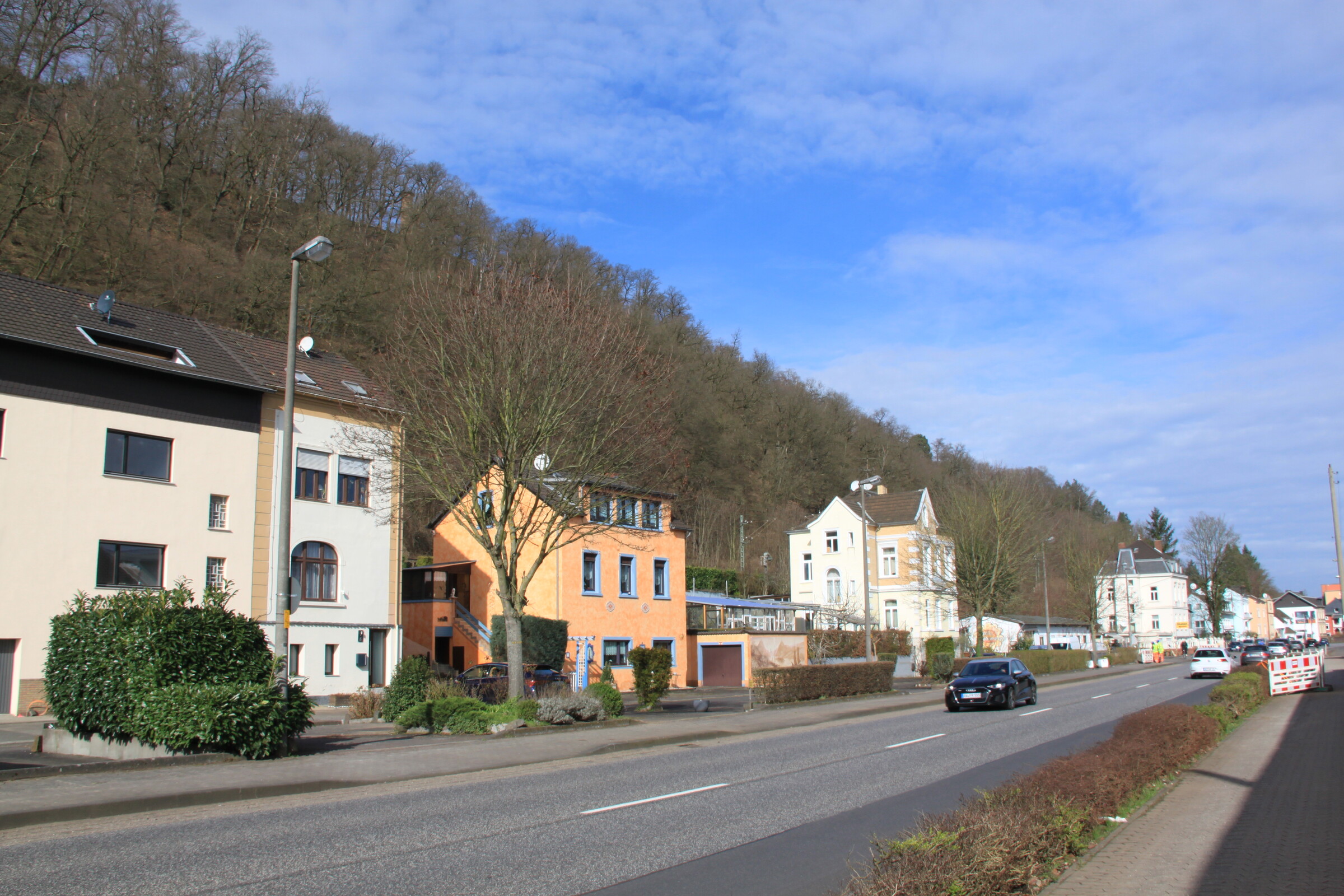 The place consists of a number of buildings (houses, apartment blocks, an old wharf, some stores) along the B9 highway. Parallel to the road runs a pedestrian promenade along the Rhine.