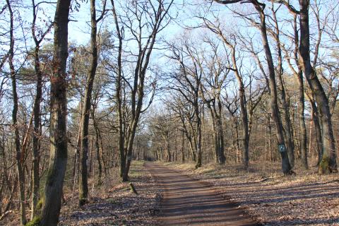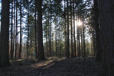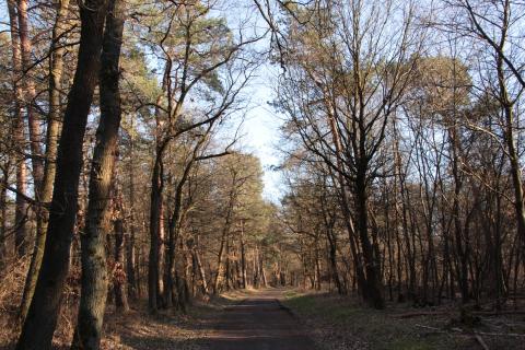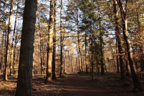 The path criss-crosses through the forest. A few teenagers on bikes made use of the uneven terrain to practice tricks. (Not pictured.)